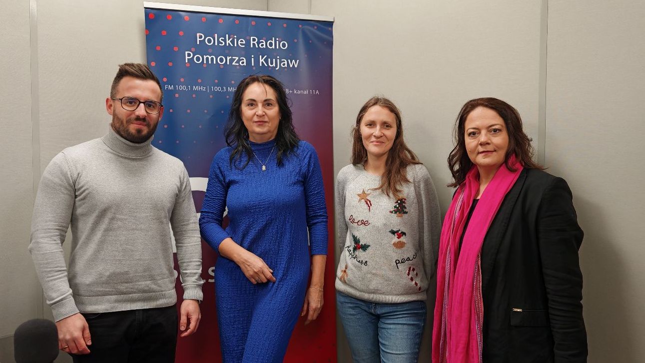 Od lewej: Radosław Świątkowski, Bożena Sawicka, Adriana Andrzejewska-Kuras oraz prof. Dorota Sylwestrzak w toruńskim studiu Polskiego Radia PiK. Fot. Zdzisłąw Nawrat
