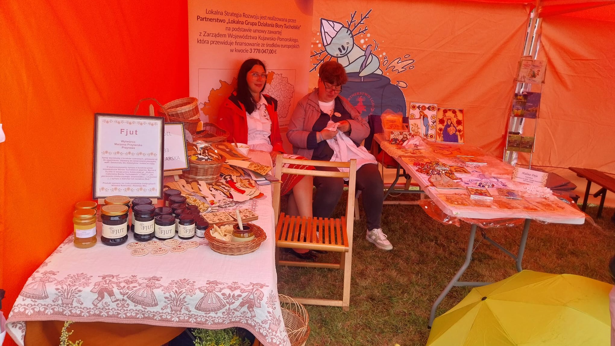– Możemy pomalować sobie kamienie albo wzory borowiackie na torbach. Mamy też panią, która maluje na szkle. Jest też nasz syrop regionalny z buraka cukrowego, czyli fjut – dowiedzieliśmy się na jednym ze stoisk.