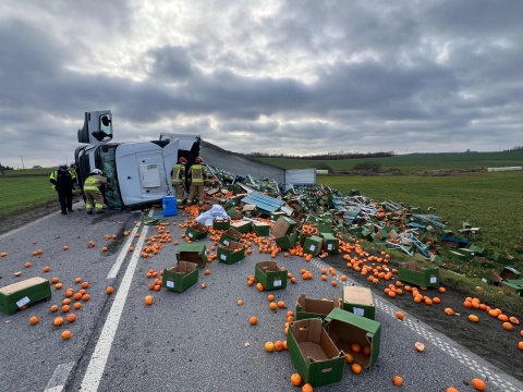 Ciężarówka z 23 tonami cytrusów przewróciła się w Jarantowicach. Kierowca w szpitalu [AKTUALIZACJA, zdjęcia]