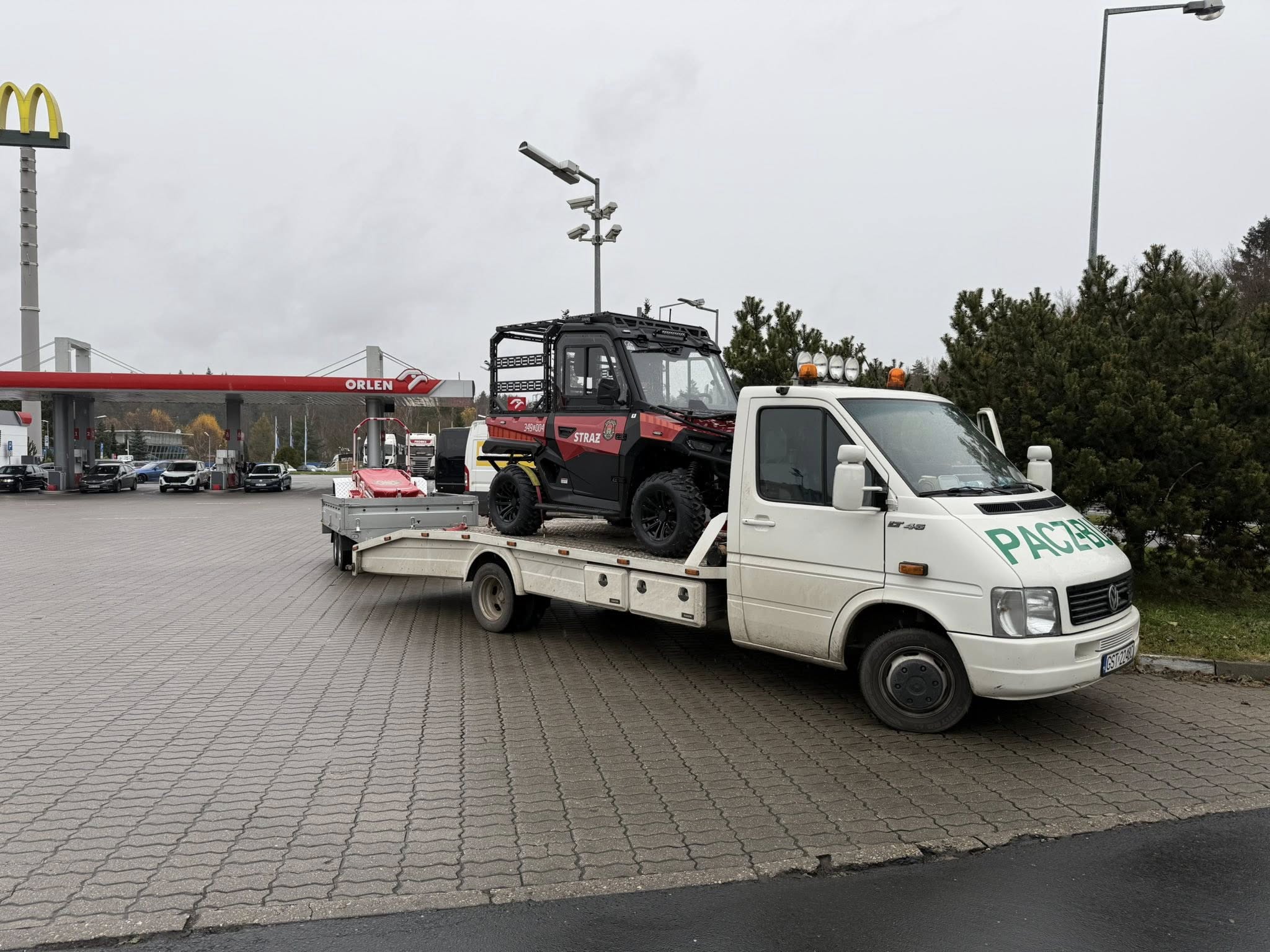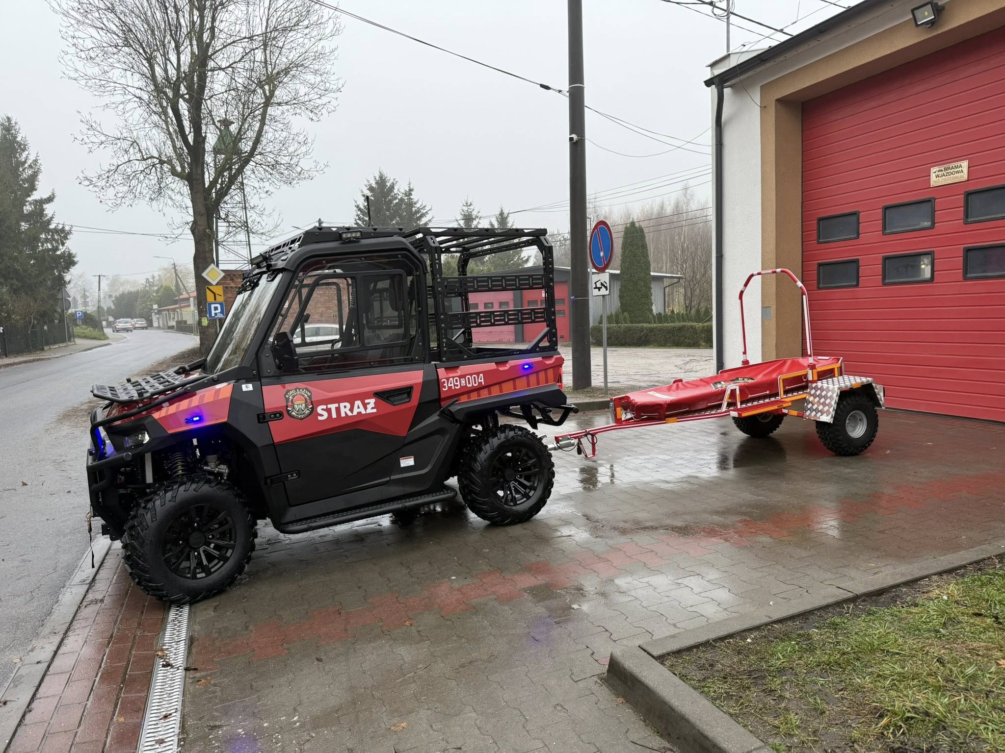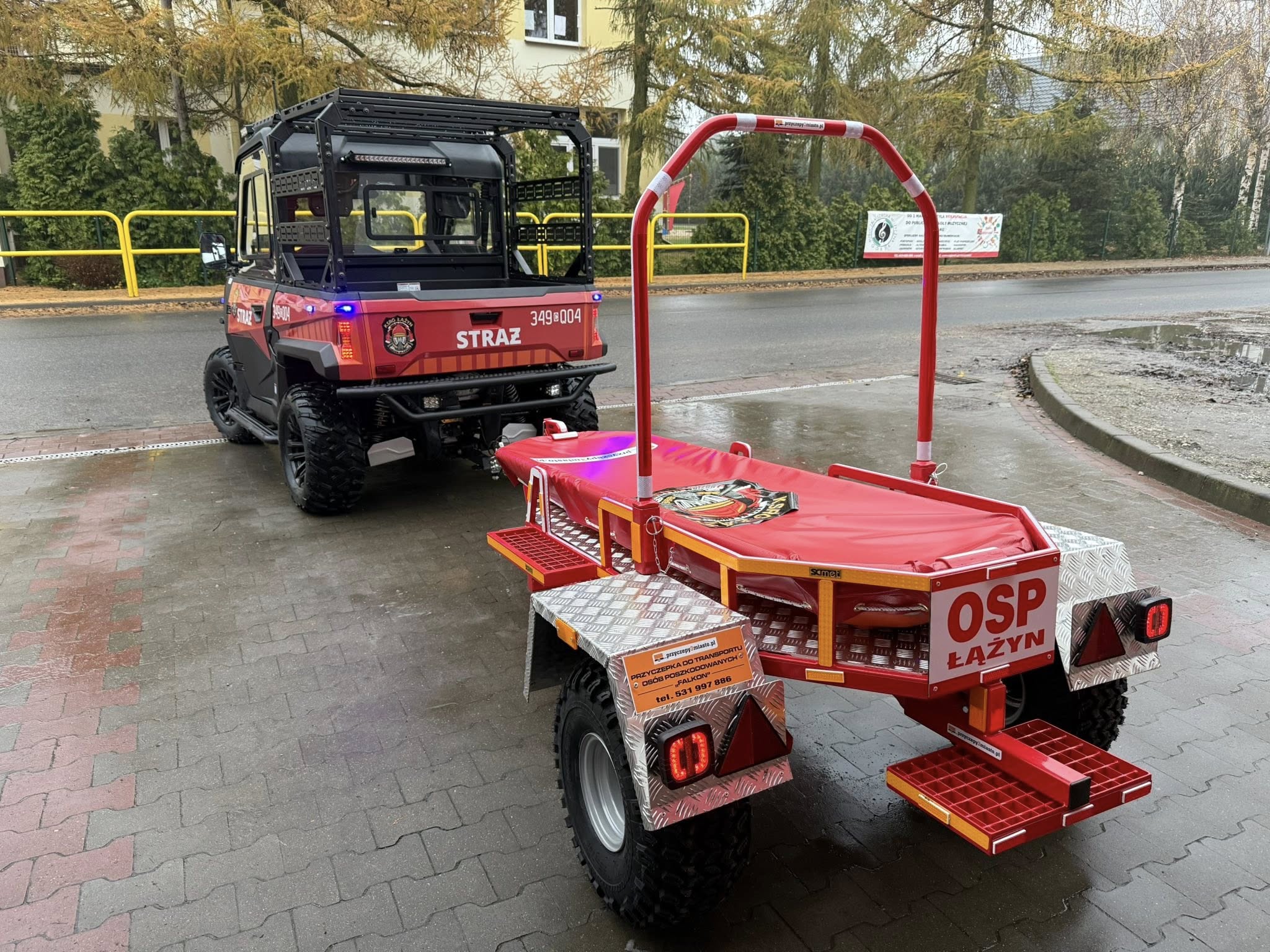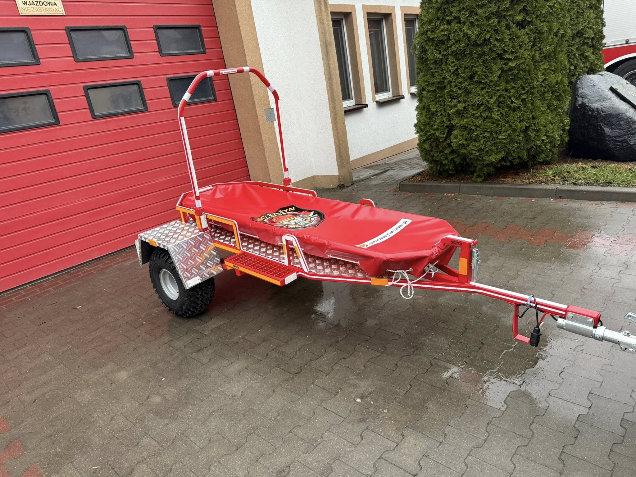 W zestawie z UTV do strażnicy dotarła także przyczepka ratownicza do przewozu osób poszkodowanych wyposażona także w podesty do transportu ratowników wraz z poszkodowanym. Obrotowy zaczep pozwala na pokonywanie trudnego terenu bez ograniczenia na haku pojazdu.
