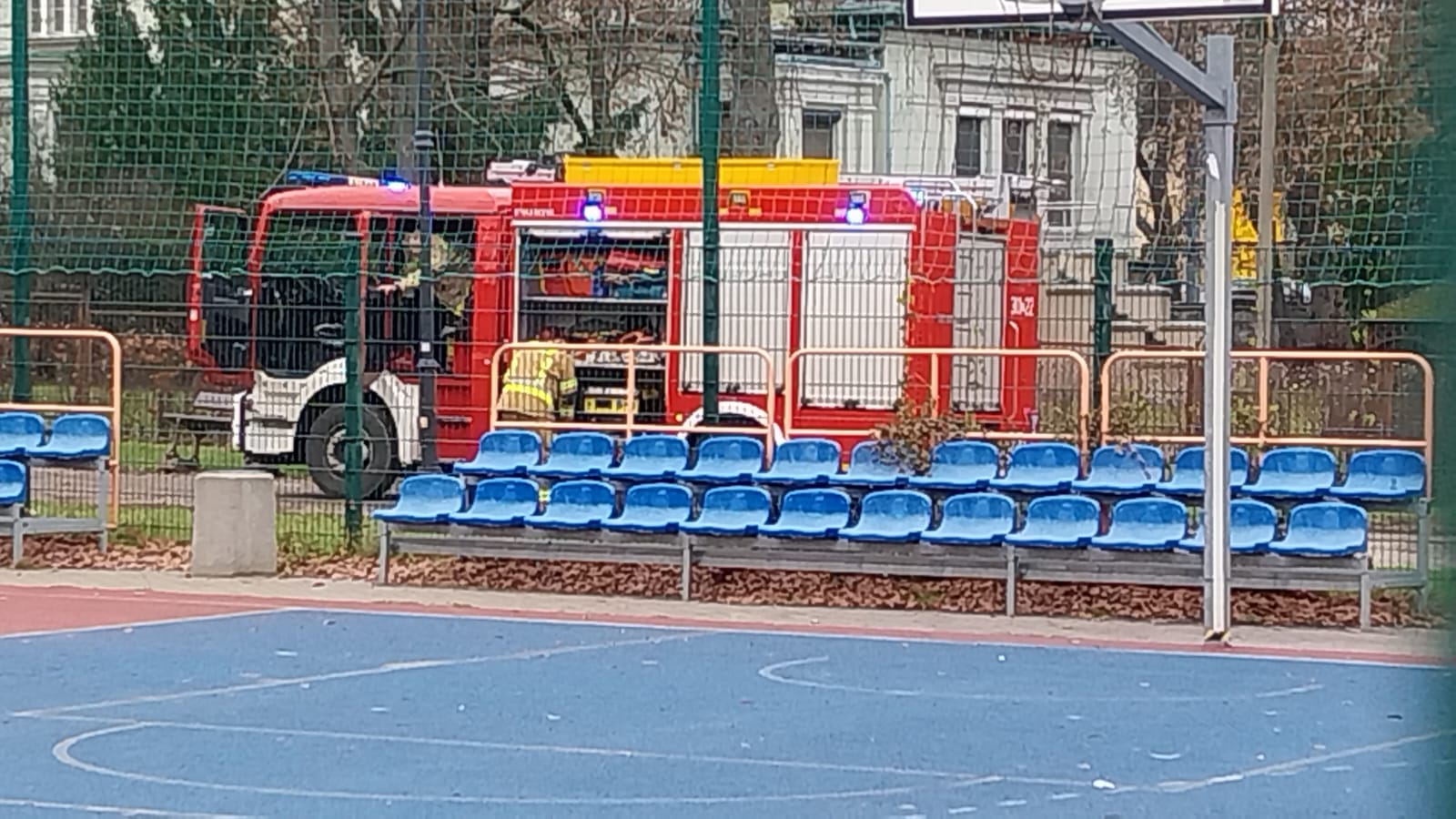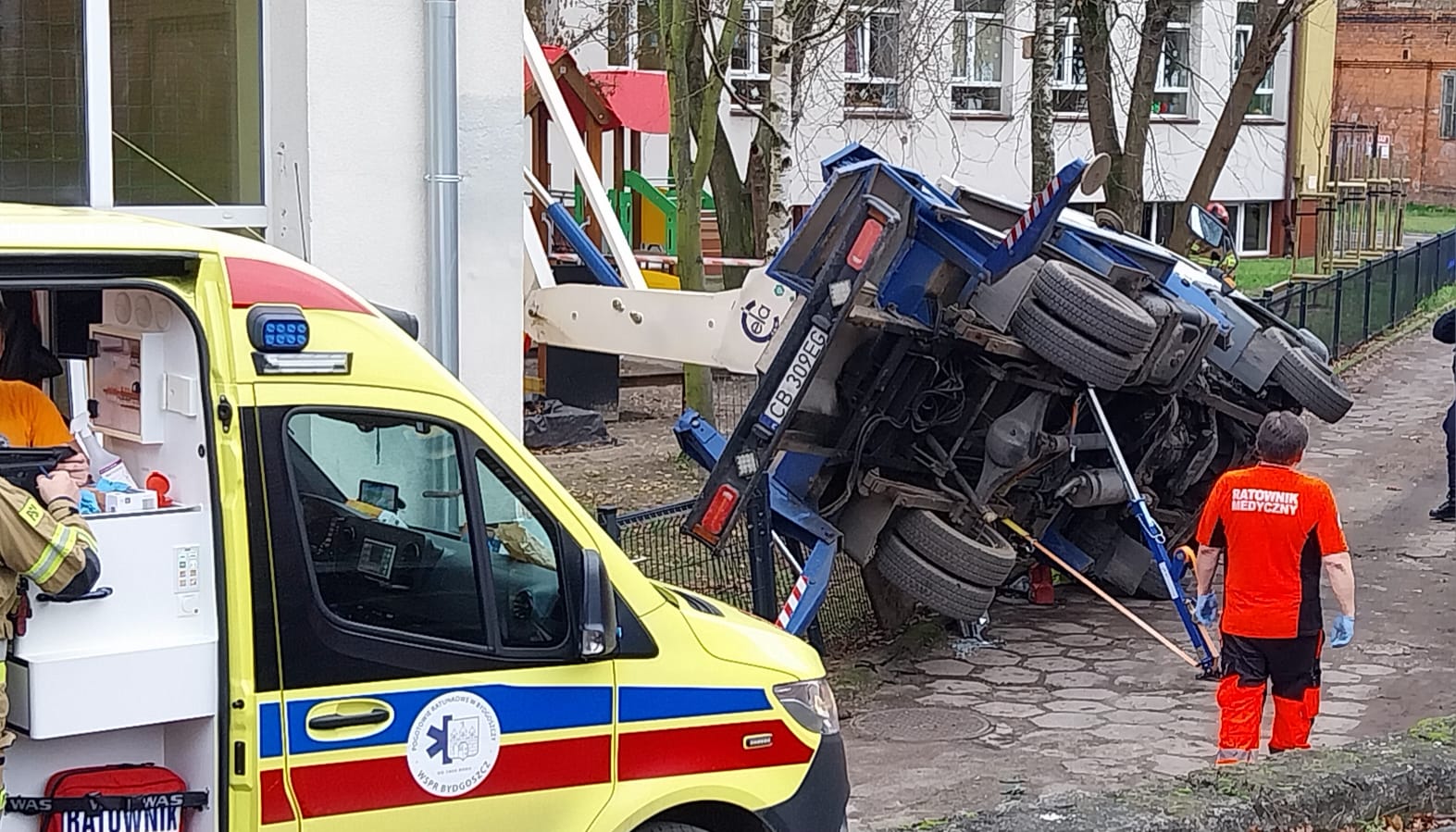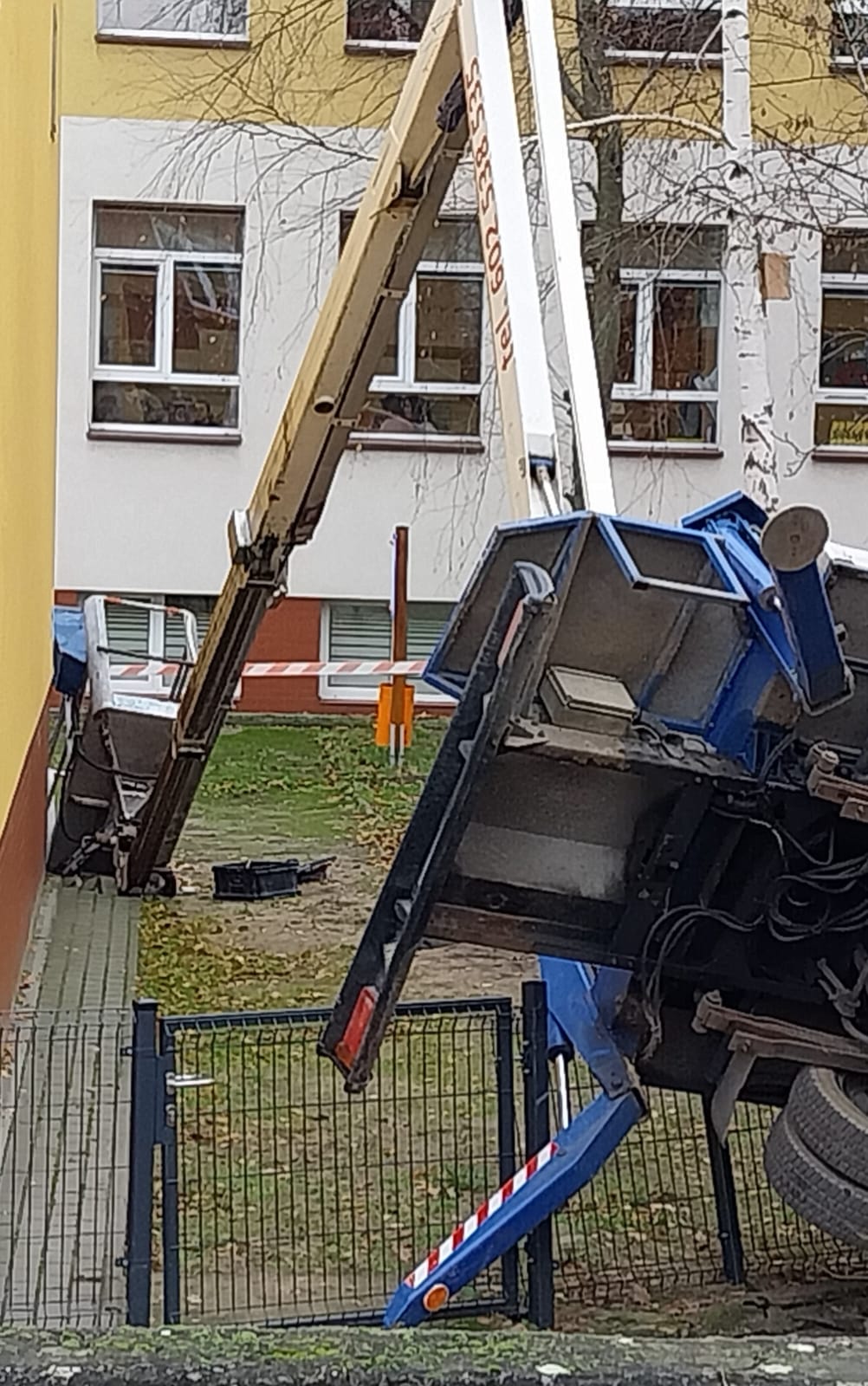 Podnośnik przewrócił się na terenie szkoły przy ul. Czartoryskiego w Bydgoszczy/fot. Marcin Kupczyk