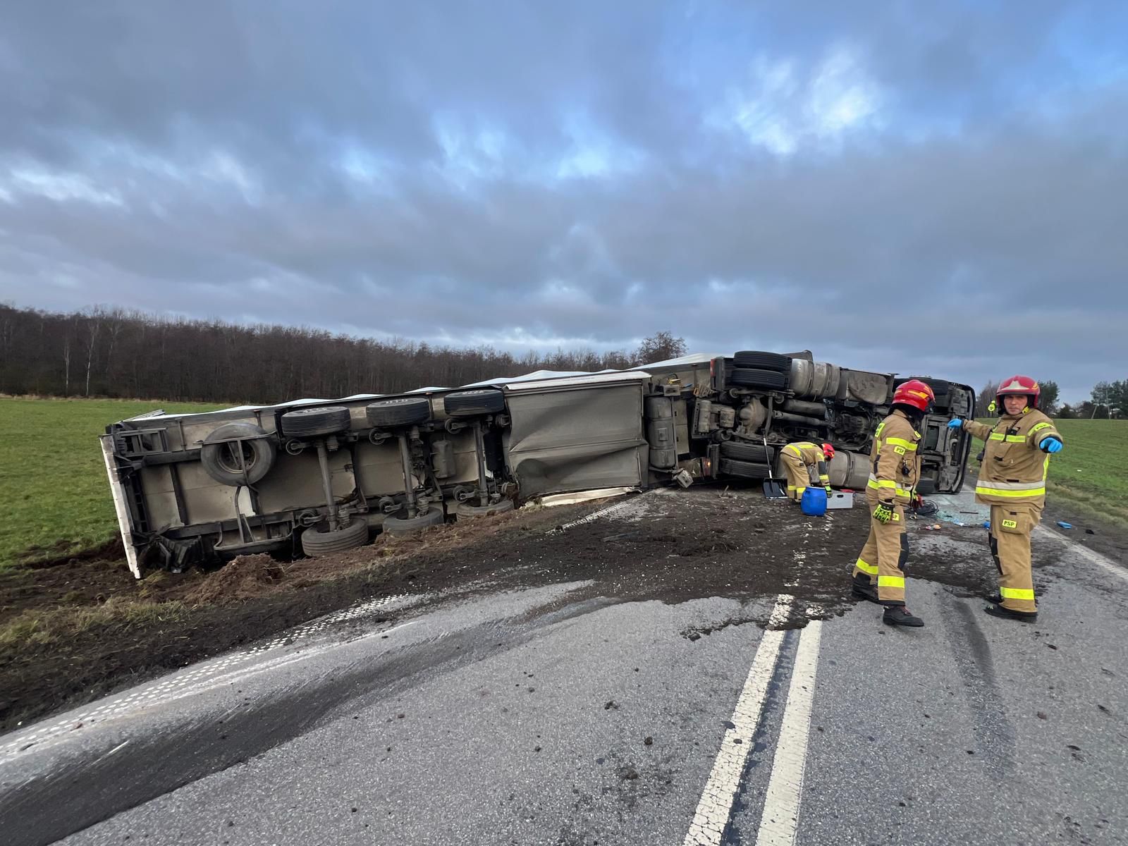 - Samochód ciężarowy przewrócił się na bok, blokując dwa pasy drogi. Na miejscu zdarzenia było już pogotowie ratunkowe i policjanci, którzy przystąpili do pomocy poszkodowanemu. Ratownicy zbadali poszkodowanego i zdecydowali, że musi zostać zabrany do szpitala w Grudziądzu. Dalsze czynności strażaków polegały na zabezpieczeniu miejsca wypadku, a także na zbieraniu paliwa wyciekającego ze zbiorników pojazdu - przekazał st. kpt. Piotr Rogowski, oficer prasowy KP PSP w Wąbrzeźnie.