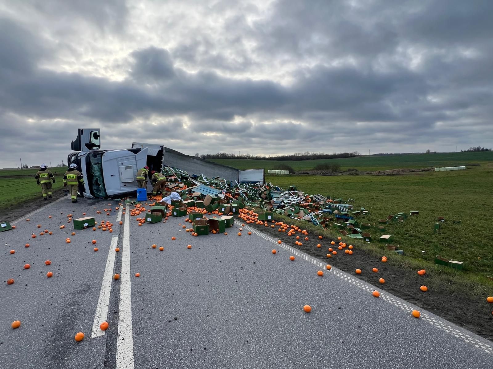 W Jarantowicach przewróciła się ciężarówka przewożąca owoce cytrusowe/fot. KP PSP Wąbrzeźno