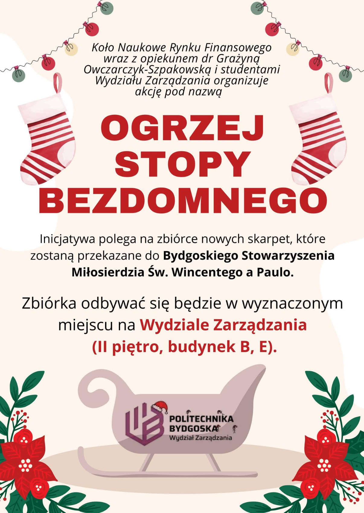 Studenci Wydziału Zarządzania organizuje zbiórkę nowych skarpet, które trafią do Bydgoskiego Stowarzyszenia Miłosierdzia św. Wincentego a Paulo.