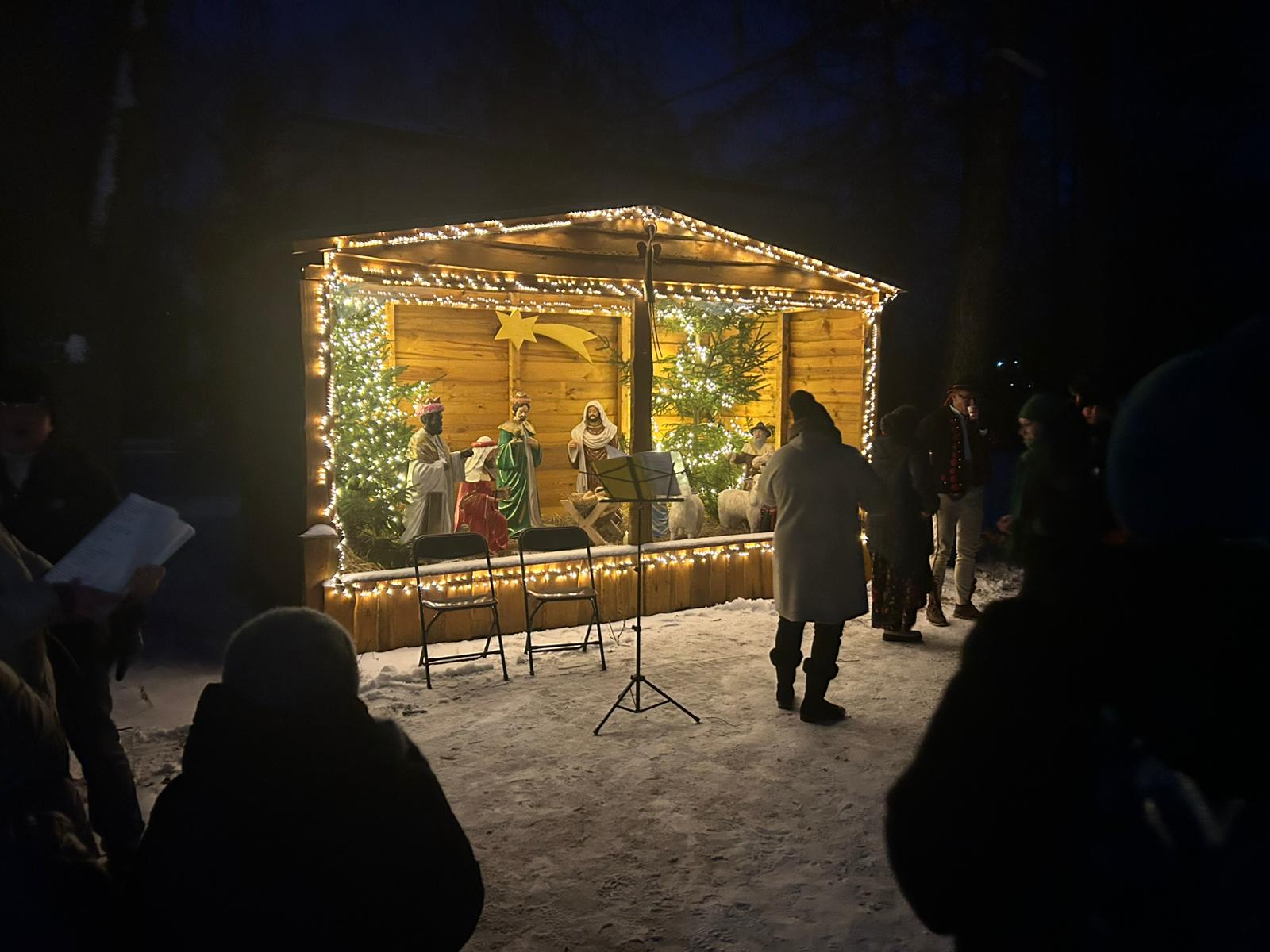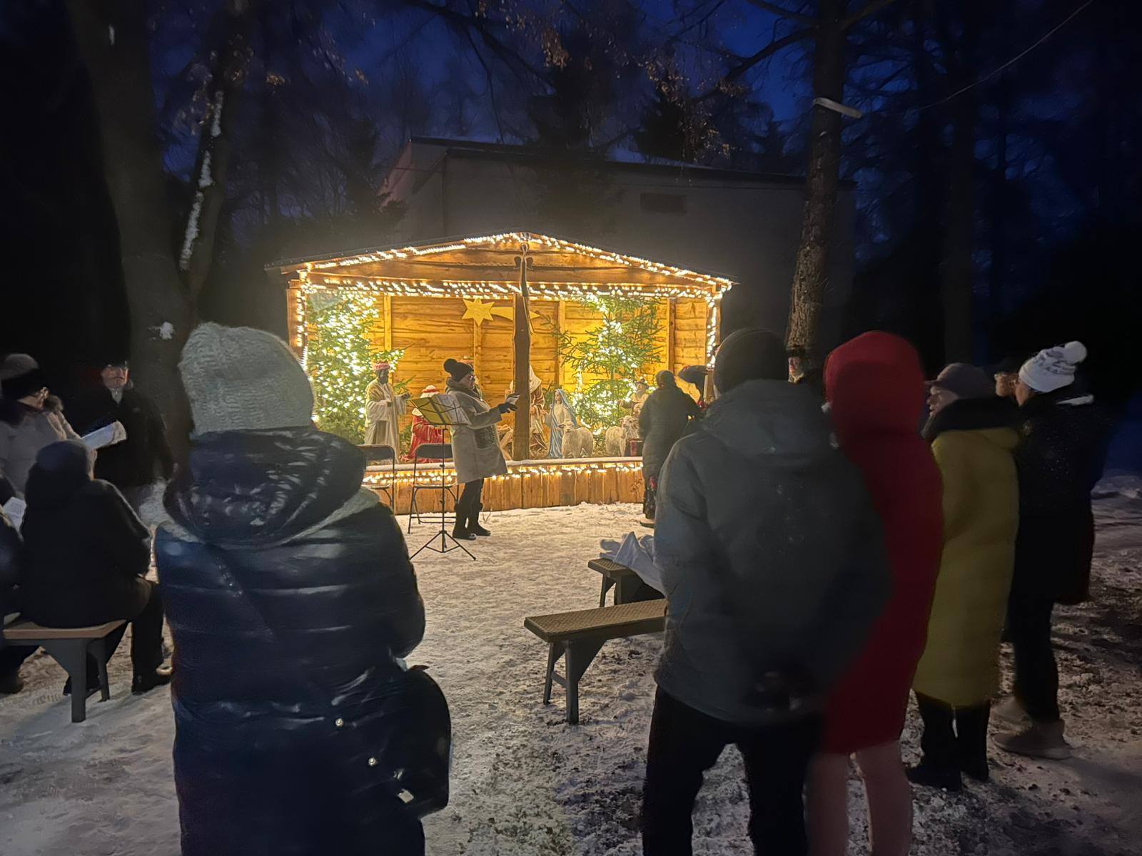 W Lubiczu Dolnym, przy padającym śniegu, obok stajenki bożonarodzeniowej i z akompaniamentem góralskich instrumentów odbyło się śpiewanie kolęd i pastorałek/fot. Robert Duliński