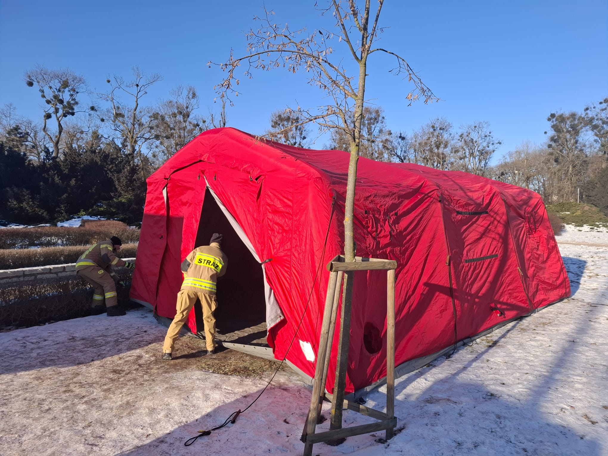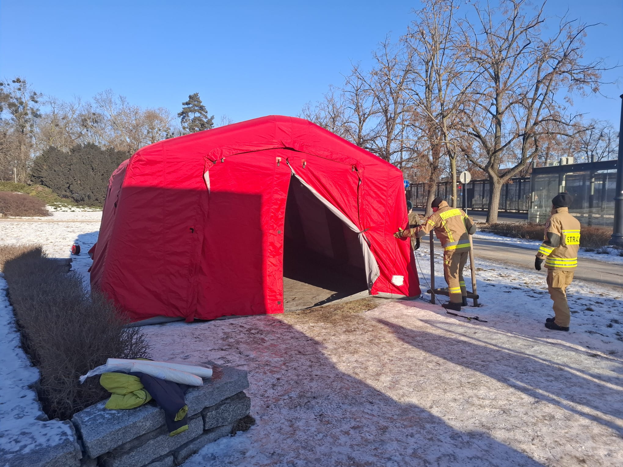 Z powodu bardzo niskich temperatur w Toruniu w sobotę w 18 lokalizacjach rozpalono koksowniki. Na Placu Rapackiego i przy Alei Solidarności stanęły dwa namioty doraźnego ogrzania. To efekt współpracy miasta z Państwową Strażą Pożarną. Mają być dostępne do 2 lutego. W weekend działają od 9.00 do 18.00, a w poniedziałek w godzinach 6:00-18:00. Będą one dostępne do 2 lutego, gdyż prognozy wskazują na spadki temperatury nawet do -22 stopni Celsjusza.