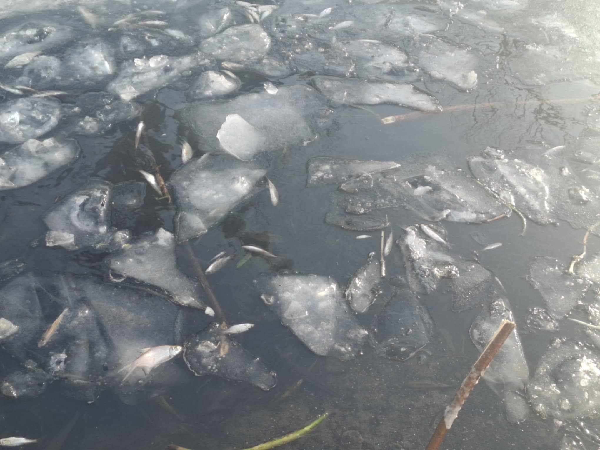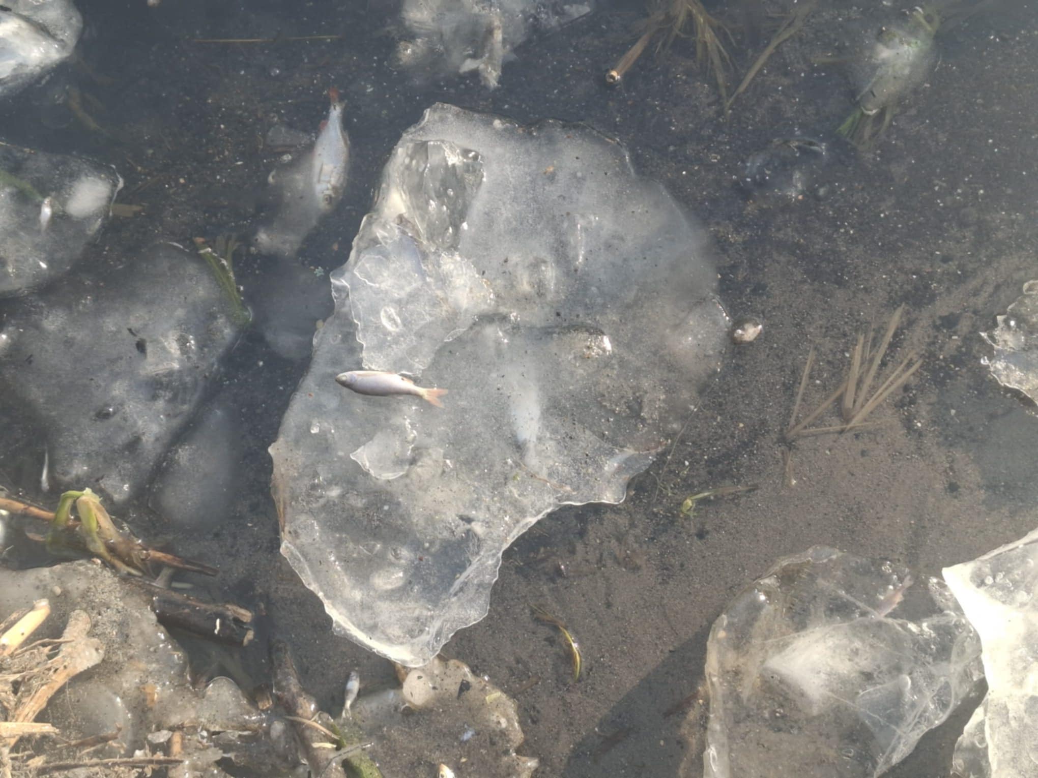 Pod lodem i w wychłodzonej wodzie widać śnięte ryby.