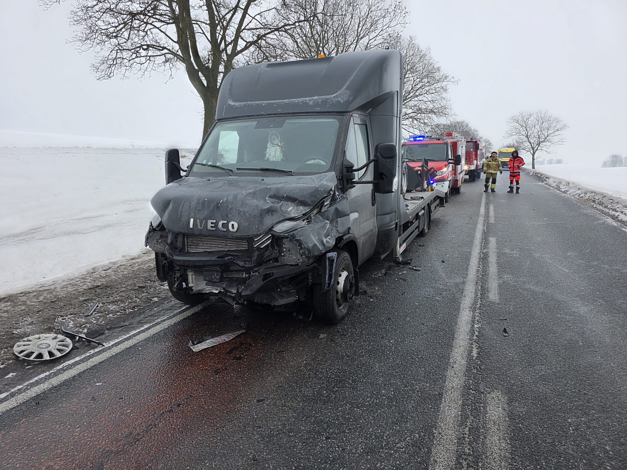 Droga jest zablokowana - to informacja z godz. 13:00. - Wszystko wskazuje na to, że do zdarzenia przyczyniła się pogoda - mówi Łukasz Kowalczyk. - Samochód osobowy zjechał na przeciwległy pas ruchu i bokiem zderzył się z iveco jadącym z przeciwka. Wszystko wskazuje na to, że śliska jezdnia przyczyniła się to tego wypadku - dodaje. Na miejscu trwała też akcja reanimacyjna wobec kierowcy osobówki. W stanie krytycznym przewieziono go do szpitala.