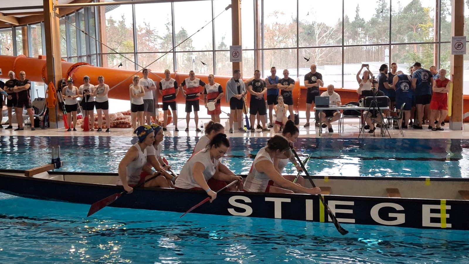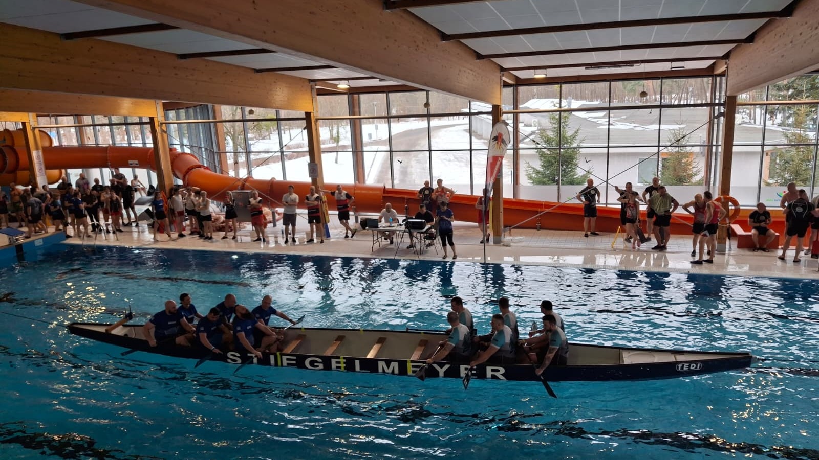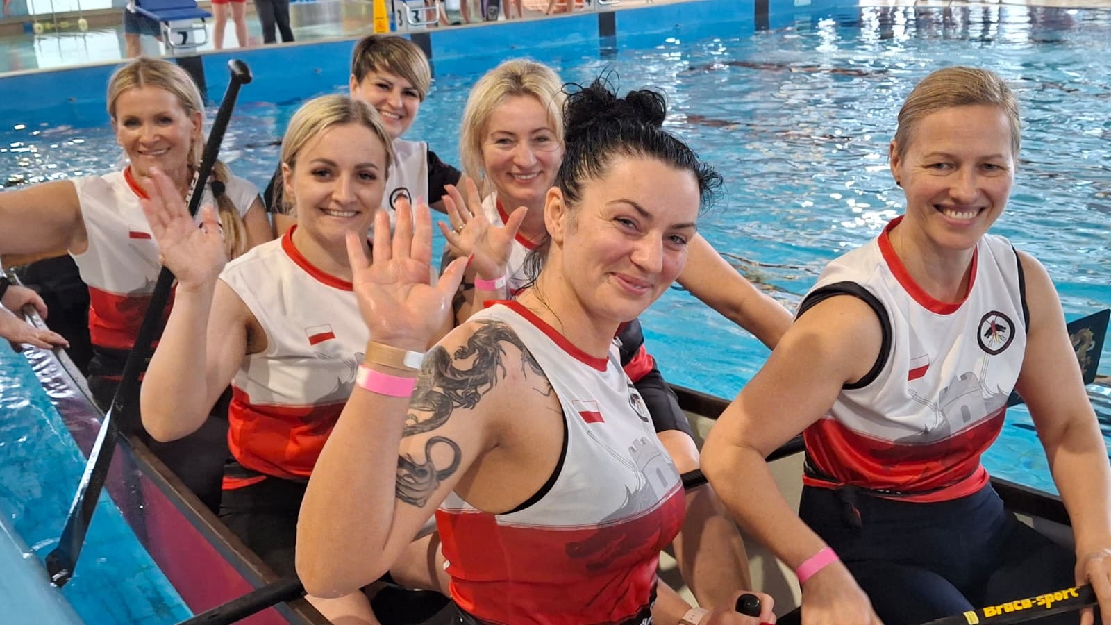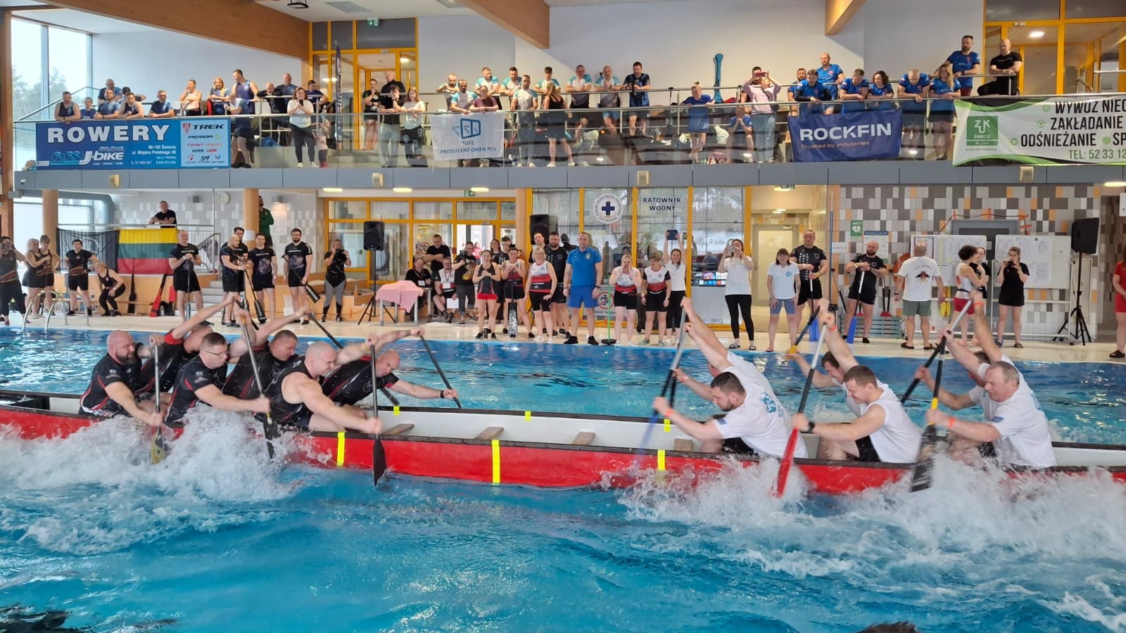 Liczy się, kto kogo przepchnie! Smocze łodzie ścigają się na basenie w Świeciu [wideo]