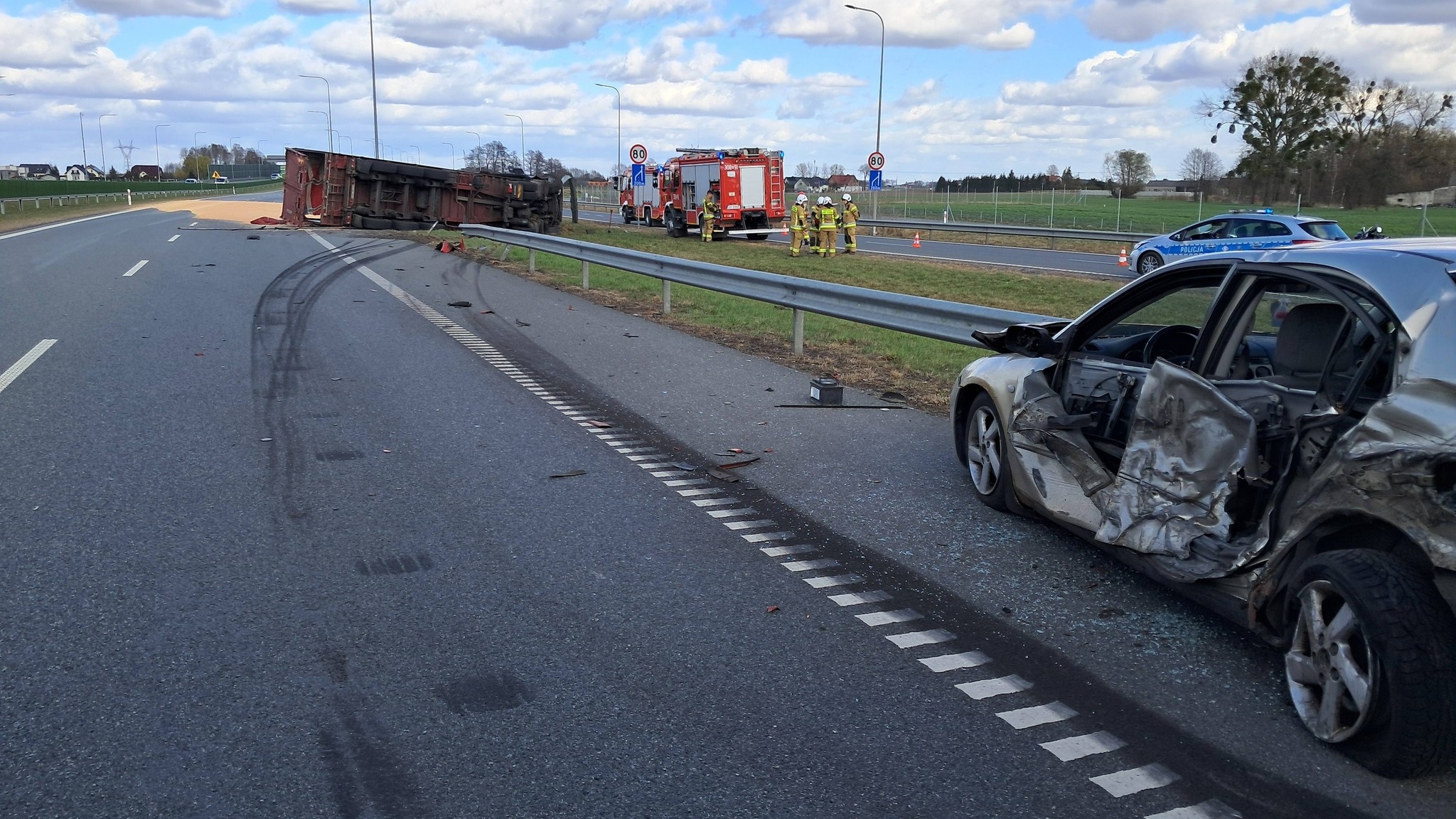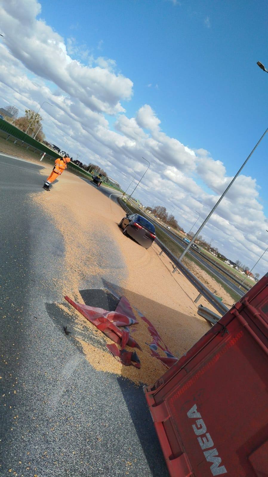 Jak wynika z informacji służb, samochód ciężarowy zderzył się z osobowym. Przewożona przez ten pierwszy pojazd kukurydza wysypała się na jezdnię główną. W akcji brał udział śmigłowiec Lotniczego Pogotowia Ratunkowego, który lądował na miejscu zdarzenia. W wypadku ranna zostały dwie osoby.