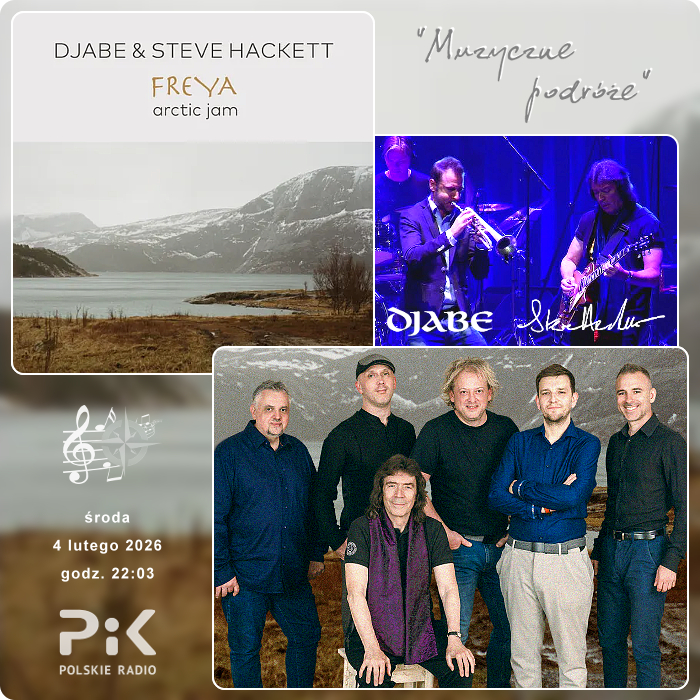 Choć luty przywitał nas szczypiącym mrozem, to jednak trudno narzekać na taką zimę :) Korzystający z zimowych ferii mają powody do zadowolenia, a my w pierwszy środowy wieczór lutego również skorzystamy z takiej oprawy, by udać się w stronę... Arktyki :) Może nieco ironicznie dla niektórych jawi się kierunek na naszym muzycznym drogowskazie, ale często winić za to możemy nasze wyobrażenia :) Z pewnością będzie to nietypowa wędrówka na pięcioliniach, która zawiedzie zainteresowanych 100 kilometrów na północ od koła podbiegunowego. Zatrzymamy się w portowym mieście Bodø, na półwyspie o tej samej nazwie, wciśniętym między Vestfjorden i Saltfjorden. Już pobieżna obserwacja pocztówek stamtąd pozwala uśmiechnąć się do specyficznego uroku tego miejsca poza kołem podbiegunowym, a przecież to nie najdalej wysunięte na północ rejony Norwegii :) O wiele dalej zabrali nas kiedyś Moddi i Mari Boine :) Do celu naszej wędrówki na pięcioliniach zaprowadzi nas tym razem muzyka wynikająca ze szczególnej artystycznej symbiozy, będąca kolejnym owocem współpracy bardzo ciekawego kwintetu z Budapesztu i jednego z najznamienitszych poetów gitary. DJABE & STEVE HACKETT. Z tą spółką w „Muzycznych podróżach” z Polskim Radiem PiK udaliśmy się prawie 5 lat temu na Sardynię. Sam Mistrz STEVE HACKETT wielokrotnie zabierał nas swoją muzyką do różnych miejsc na naszej błękitnej planecie, a teraz jego gitary i harmonijka ustna w symbiozie z brzmieniem DJABE mają szansę oczarować „muzycznych podróżników”, jak z końcem stycznia 2024 roku wprowadzili w muzyczny trans przybyłych na festiwal Bodø Jazz Open...