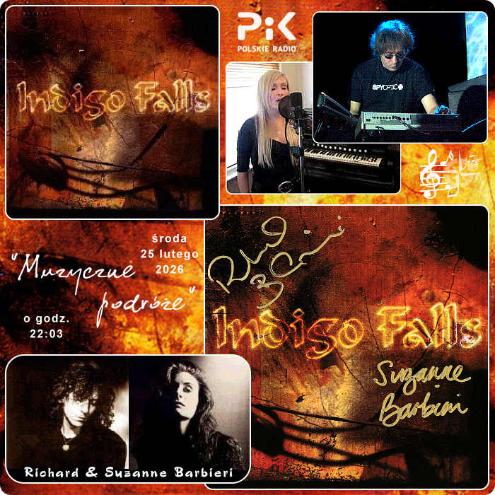 Zamykając luty na szlakach „Muzycznych podróży” z Polskim Radiem PiK, zapraszam do bardzo nastrojowej wędrówki na pięcioliniach. O ile pogodna aura utrzyma się do późnych godzin wieczornych ostatniej środy lutego, stworzy nam doskonałą oprawę dla dźwięków na naszym szlaku. A podążać będziemy kup przeszłości odległej o 29 lat, oznaczonej rudymi odcieniami okładki albumu, który prowadzić nas będzie do wodospadów w kolorze indigo... Tak nazwali swój projekt RICHARD i SUZANNE BARBIERI, małżeństwo doskonale dogadujące się w studiu i zapisane nazwiskami na wielu listach charakteryzujących osobliwy nastrój ambitnej muzyki rockowej. O ile ktoś zainteresował się wspomnianą kolorystyką dźwięków, to uprzedzam, że INDIGO FALLS jest miejscem spotkania wielu przyjaciół, z których każdy wnosi inny odcień na wykorzystaną tutaj paletę barw... Zaczynając zatem od rudych w całym bogactwie ich tonacji, poprzez wątki karmazynowe, dojdziemy do wodospadów opadających uspokajającymi odcieniami indigo... Woda ma w tym przypadku zarówno walor budujący nastrój, jak również refleksję przemijania, niepowtarzalności, wyjątkowości chwili... RICHARD jest mistrzem brzmień klawiszowych, którego charyzma wpisała się w twórczość formacji JAPAN czy do dzisiaj zdobi twórczość PORCUPINE TREE. Po jego talent sięgali choćby David Sylvian, Holger Czukay, Ryuichi Sakamoto Robert Fripp, Tim Bowness, Theo Travis czy też znani z naszych środowych wędrówek na pięcioliniach Stefano Panunzi i Steve Hogarth. Nie można pominąć również spółki Steve Jansen, Richard Barbieri i Mick Karn... Wiele z tych nazwisk usłyszymy w trakcie spaceru do wodospadów indigo :) Barwa wokalna i talent literacki SUZANNE, żony Richarda, również zdobiła wiele projektów z udziałem wspomnianych tutaj artystów, zatem Jej udział dzisiaj może być sugestią rozrysowania kolejnych map naszych „Muzycznych podróży” z Polskim Radiem PiK :)