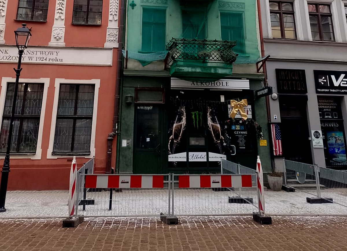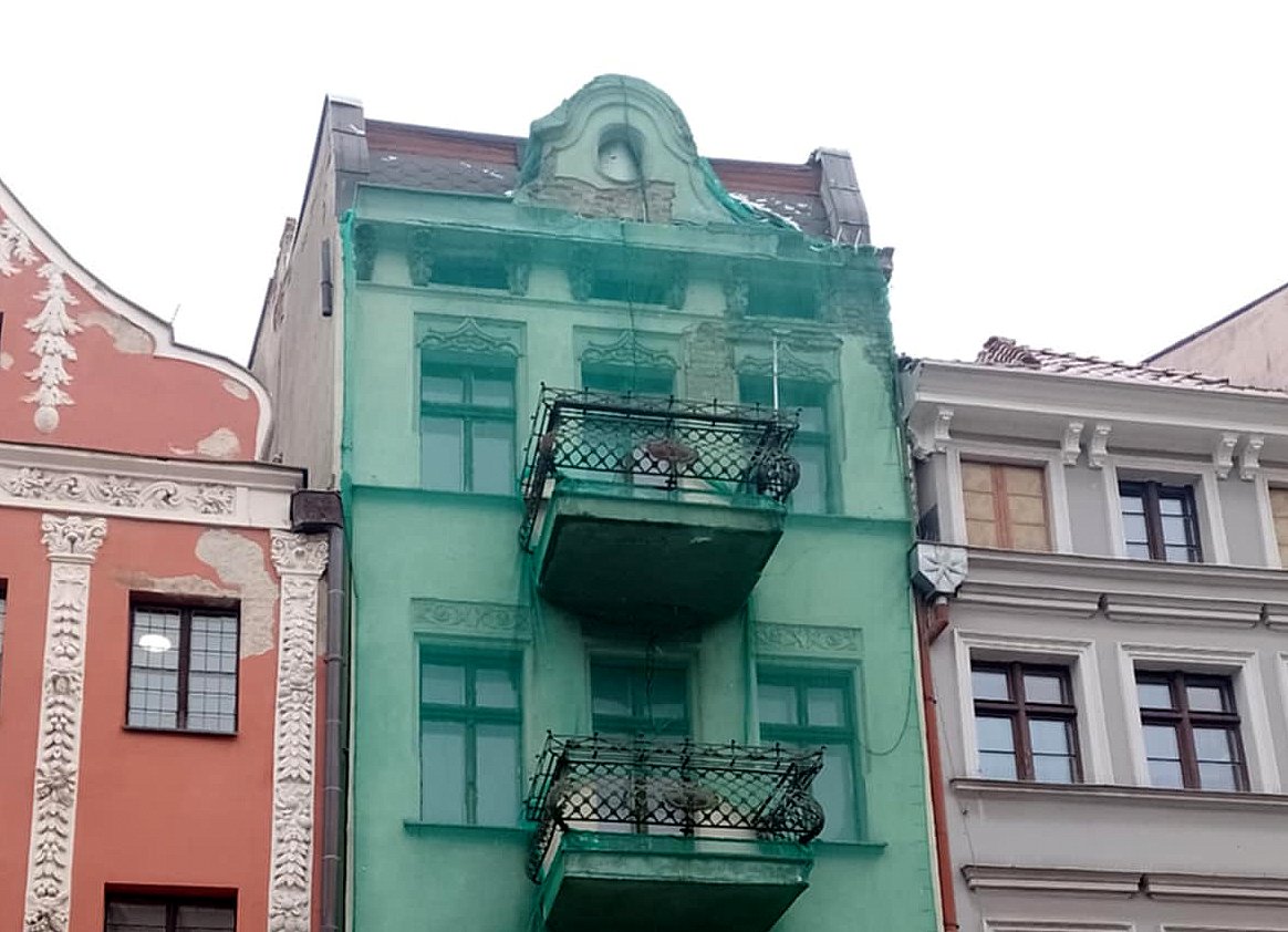 Fragment elewacji oderwał się od jednej z kamienic na toruńskiej Starówce. Fot. Michał Zaręba/PR PiK