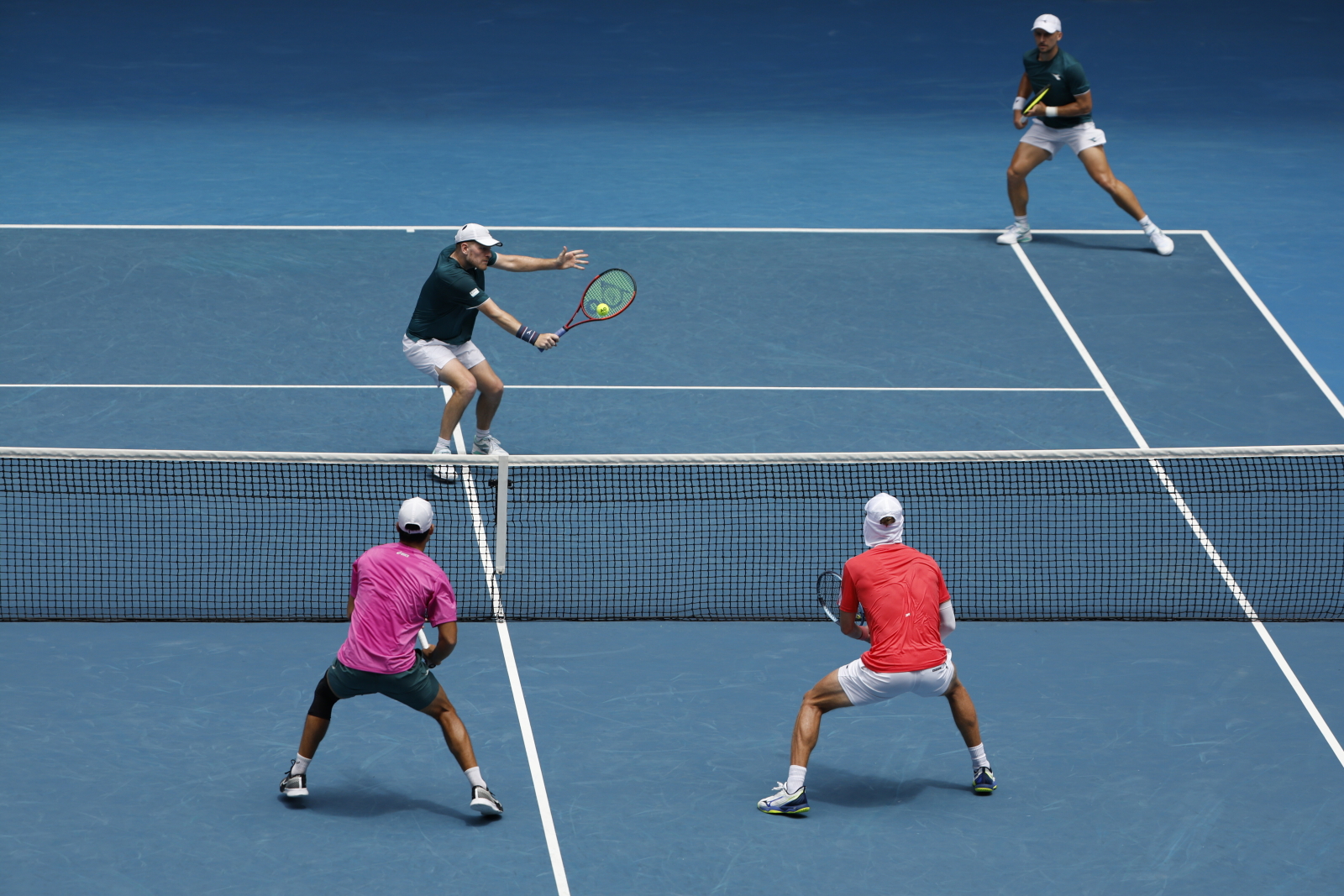 Jan Zieliński (w prawym górnym rogu) nie zdołał awansować do drugiego deblowego finału AO w karierze/fot. PAP/EPA/Rob Prezioso
