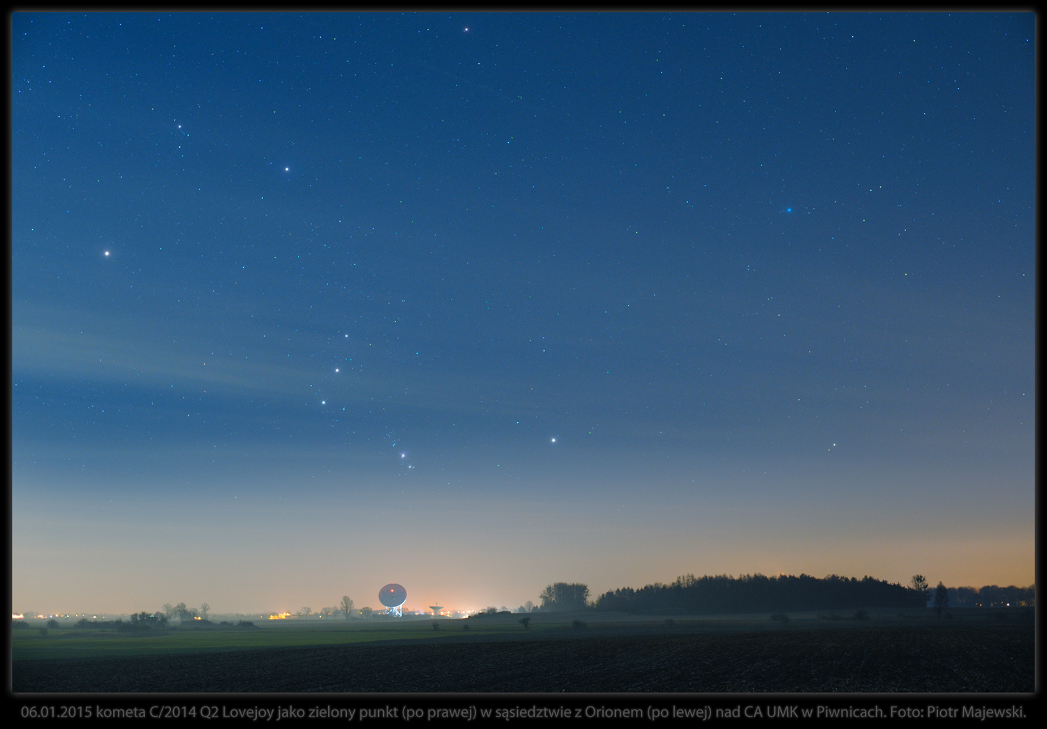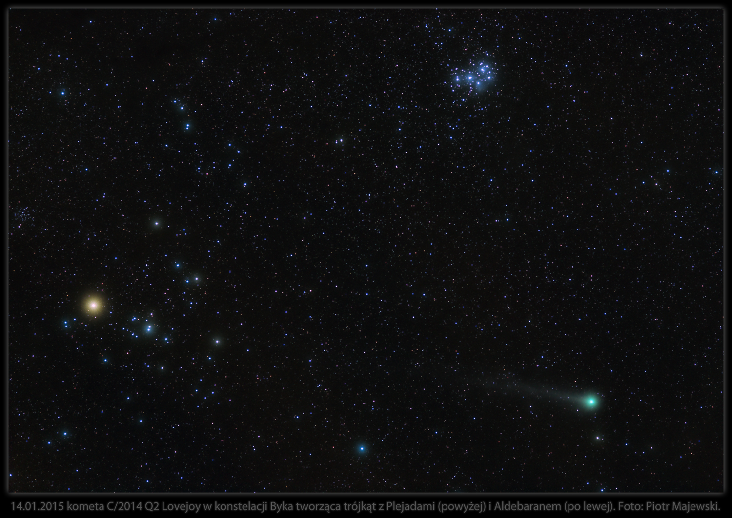 Nawet najwięksi optymiści nie podejrzewali, że kometa C/2014 Q2 Lovejoy stanie się bez trudu dostrzegalna gołym okiem spoza miejskich świateł, a jej warkocz rozwinie się na niebie na długość kilkunastu stopni kątowych! Wprawdzie całe swe piękno ukazuje dopiero na zdjęciach, ale w bezpośrednich obserwacjach także robi wrażenie. W połowie stycznia minęła Ziemię w odległości 70 milionów kilometrów i choć teraz już się od nas oddala, to przez jakiś czas powinna utrzymywać swoją jasność w związku z przejściem przez peryhelium (orbitalny punkt przysłoneczny) 30 stycznia 2015.