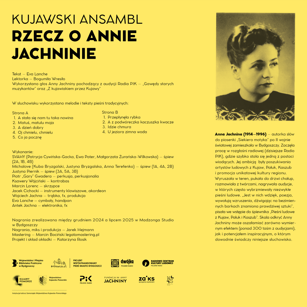 Anna Jachnina w latach 50., 60. i 70., dokonała wspólnie z m.in. Pawłem Billertem, nagrań zespołów i śpiewaków ludowych z terenów Kujaw, Pałuk i Kaszub. Na ich kanwie stworzyła około 300 audycji radiowych. Jej twórczością zajął się wnuk, Wojciech Jachna. Jak mówi, do spuścizny babci dojrzewał długo. Gdy był dzieckiem czy nastolatkiem, babcia była po prostu babcią. - Z babcią było o tyle ciekawie, że wiedzieliśmy, że przeżyła Auschwitz, że działała w Armii Krajowej, a później była dziennikarką i zajmowała się kulturą ludową, natomiast byłem w takim wieku, że mnie to niespecjalnie interesowało - opowiada. - Potem byłem nastolatkiem, zainteresowała mnie muzyka gitarowa, punkrockowa. Wiedzieliśmy, że jest wybitną dziennikarką, która dostawała medale i w ogóle jej mieszkanie wyglądało jak małe muzeum, ale ona nigdy o tym nie opowiadała. Chyba widziała, że my się tym niespecjalnie interesujemy, więc miała do tego pełen dystans i tak zwany luz. Teraz po prostu sam dojrzałem do pewnych rzeczy - tak, jak się dojrzewa w pewnym wieku i zaczyna się szukać korzeni, także muzycznych. Stąd to słuchowisko.