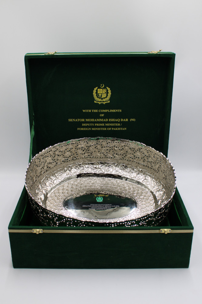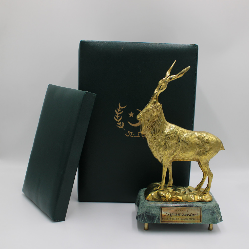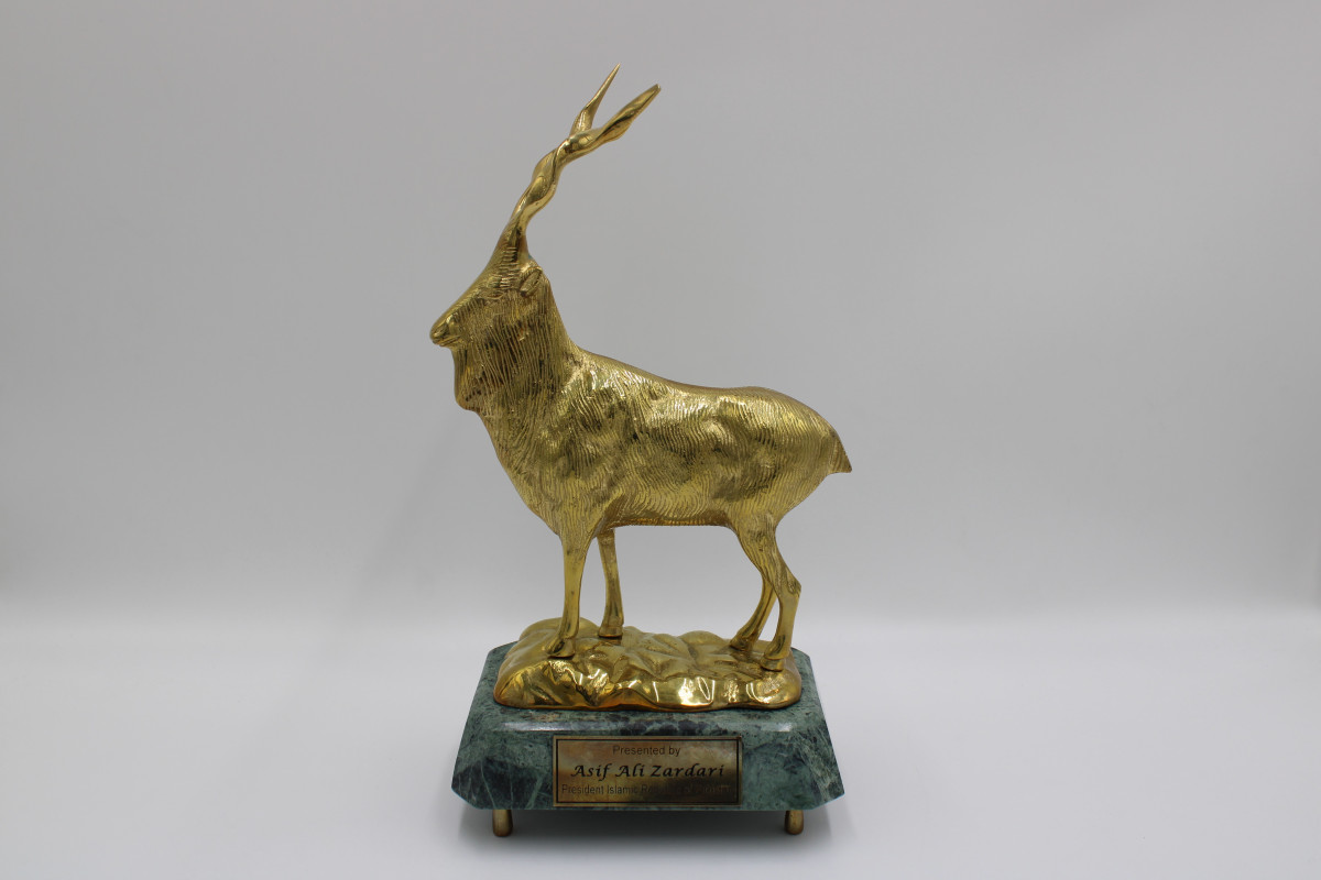 Kolejny dar nawiązuje do bogactwa przyrody Pakistanu. To statuetka markura śruborogiego (Capra falconeri). Masywna figura z polerowanego mosiądzu przyciąga wzrok intensywnym blaskiem, a delikatne żłobienia oddają fakturę gęstej sierści zwierzęcia.