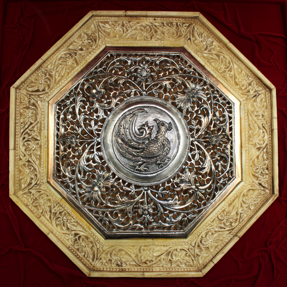 Obramowanie wykonano z rzeźbionej kości wielbłąda – cenionego w Indiach surowca, pozyskiwanego od zwierząt, które zakończyły swój naturalny cykl życia. W Radżastanie wielbłądy, nazywane „statkami pustyni”, są nieodłącznym elementem krajobrazu i kultury. Po ich śmierci lokalni rzemieślnicy nadają im symboliczne „drugie życie”, tworząc misternie zdobione dzieła sztuki.