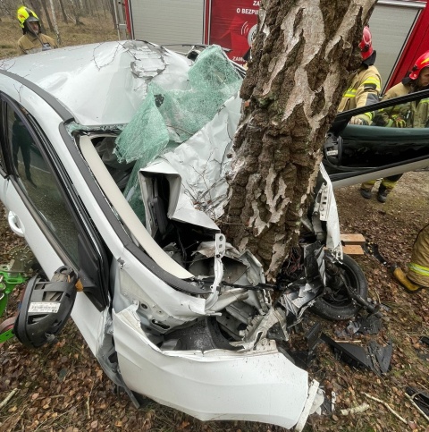 Bożenkowo. Samochód wbił się w brzozę. Uwięzionego kierowcę uwalniali strażacy [zdjęcia]