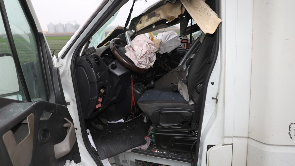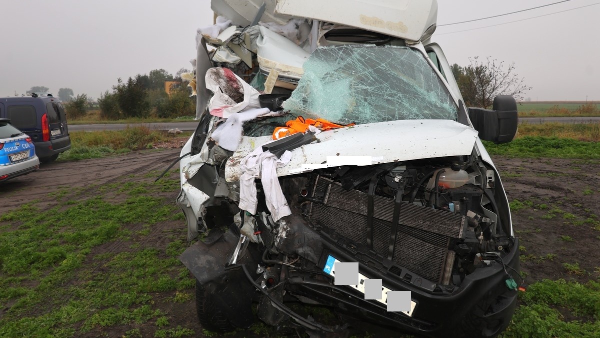 Kierowca busa trafił do szpitala na badania po tym, jak najechał na tył przyczepy ciągniętej przez traktor. Może mówić o wielkim szczęściu, kabina jego auta uległa prawie całkowitemu zniszczeniu.