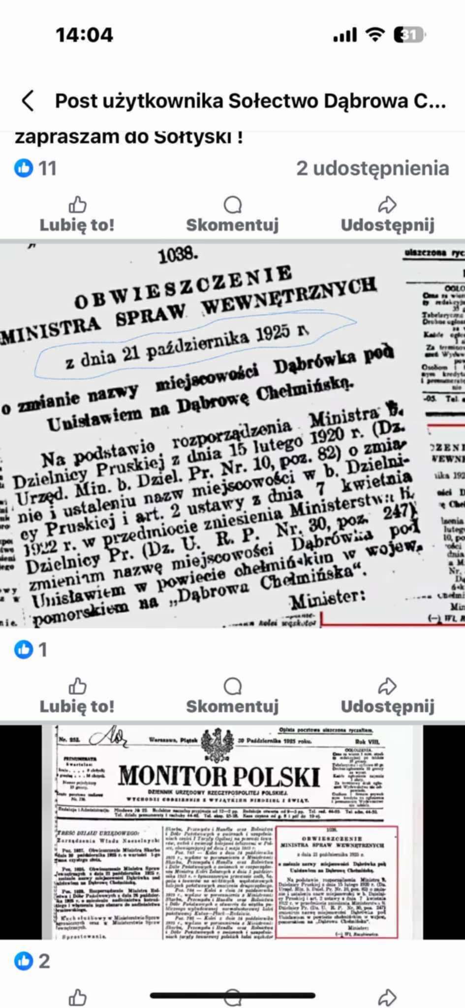 - Dąbrówka pod Unisławiem. Sto lat temu mieszkańcy naszej miejscowości poczuli się troszeczkę bardziej wyswobodzeni i już nie chcieli być „pod kimś", a tym bardziej pod Unisławiem, który jako wieś także bardzo mocno się rozrastał. Jako że jesteśmy na ziemi chełmińskiej, padła taka propozycja, żeby zmienić nazwę tej miejscowości i dodać właśnie człon „chełmińska", czyli żeby nas lokalizowało tutaj, w zakolu dolnej Wisły. Nasza miejscowość się zmieniła, jest prawie o 500 procent więcej mieszkańców. Mam nadzieję, że za 100 lat będzie tu jeszcze więcej mieszkańców, że będzie więcej dróg, nowe osiedla. Liczymy na nowych mieszkańców i zapraszamy serdecznie do gminy Dąbrowa Chełmińska - mówił wójt.