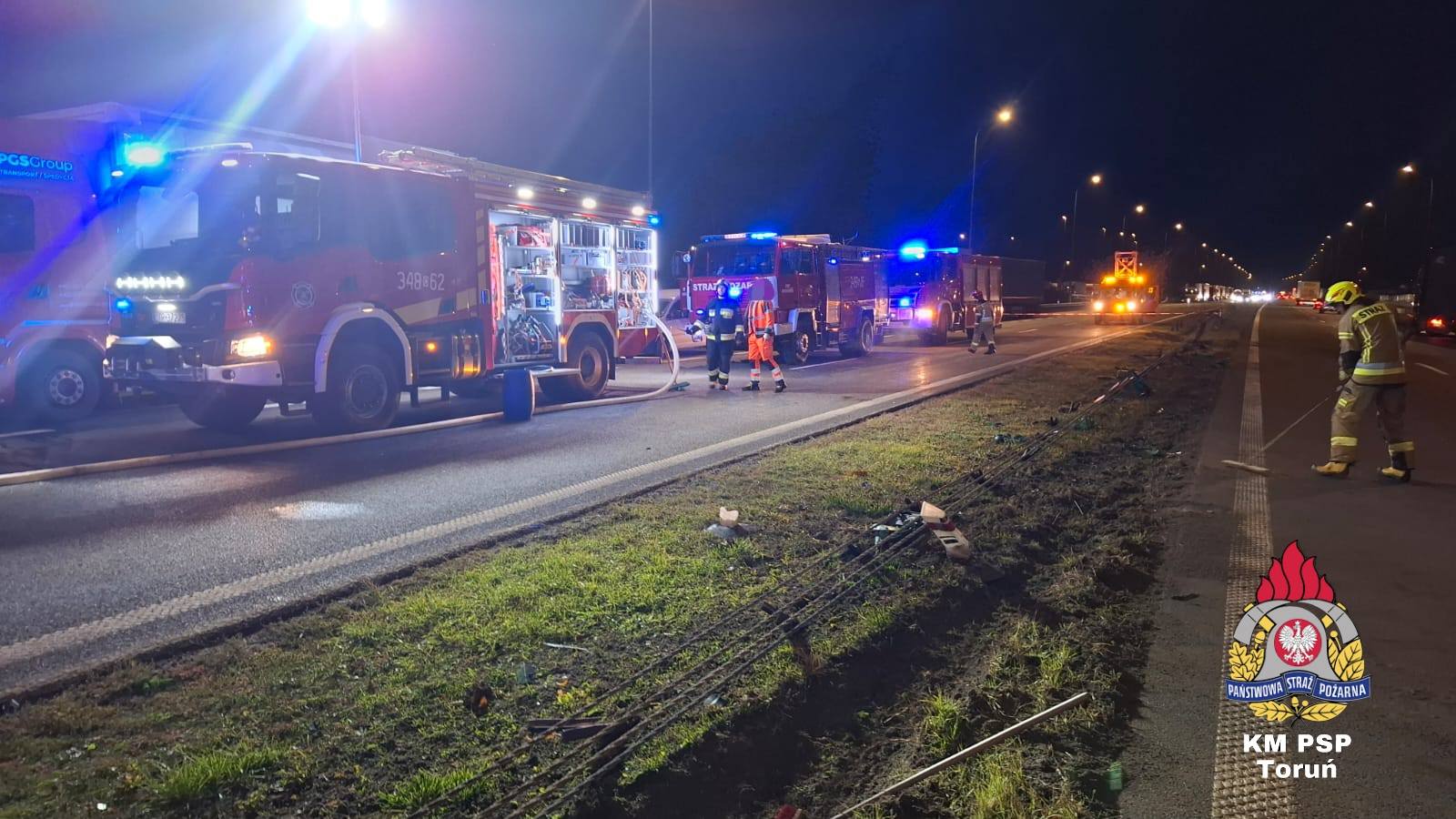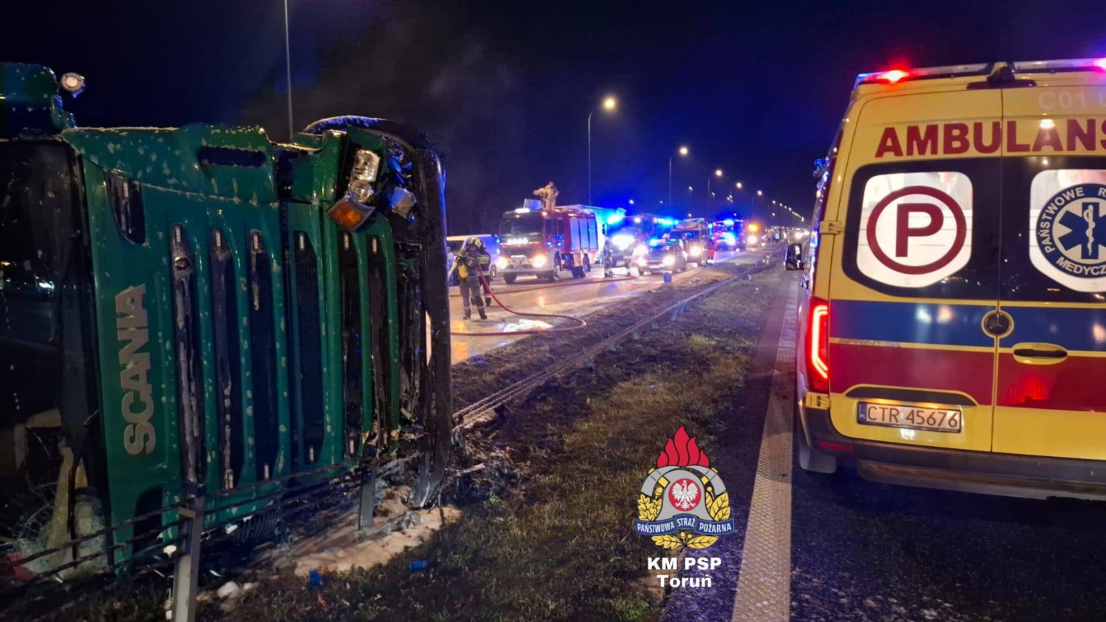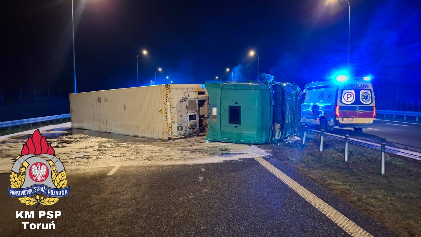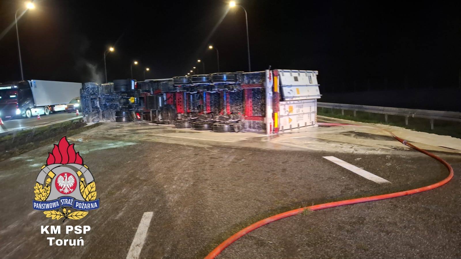 W ciężarówce przewożącej palety z mięsem wystrzeliła opona. Pojazd przewrócił się na jezdnię/fot. KM PSP Toruń