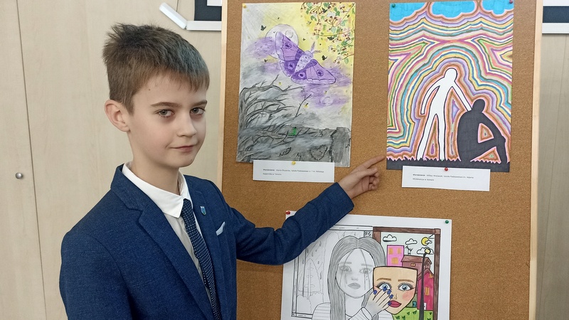 - Moja praca przedstawia człowieka w depresji, który ma przyjaciela - mówi Miłosz Wojtasiak ze Szkoły Podstawowej w Jeżewie. - Kolory pokazują świat, który jest zawsze szczęśliwy i tą jedną osobę, która tego nie widzi. Praca jest w barwach ciemnych, czarnych. Przyjaciel tej osoby w depresji jest biały. W szkole czasem rozmawiamy o problemach zdrowia psychicznego. Przychodzi do nas do klasy pani psycholog. Jest to raczej potrzebne, ponieważ są osoby z problemami, którym nikt nie chce pomóc. Gdy ja mam jakiś kłopot, to w pierwszej kolejności idę z tym do rodziców, no chyba, że jestem w szkole, to wtedy idę do pani wychowawczyni.