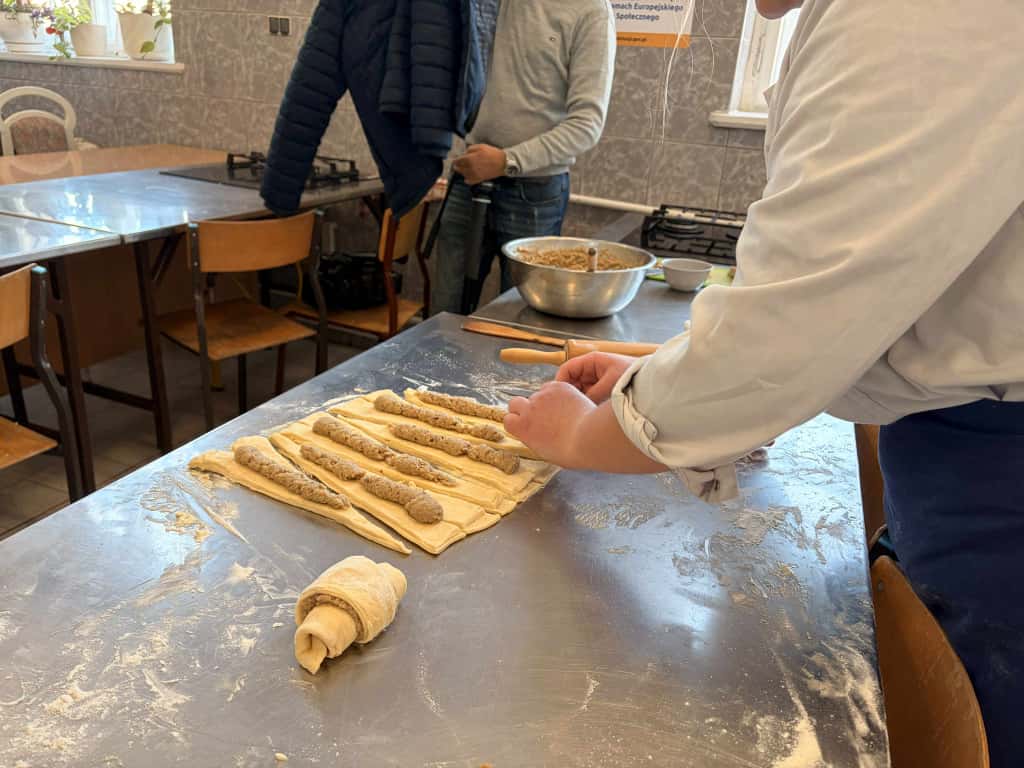 - Dzisiaj robimy rogale świętomarcińskie z białym makiem, z migdałami w środku - mówili uczniowie naszemu reporterowi, Marcinowi Dolińskiemu. - Oczywiście wszystko trzeba posłodzić, więc możemy dać miód lub cukier. Do środka dorzucamy rodzynki, a wierzch wykończymy skórką pomarańczową i orzechami. Ciasto półfrancuskie sporządzamy sami.
