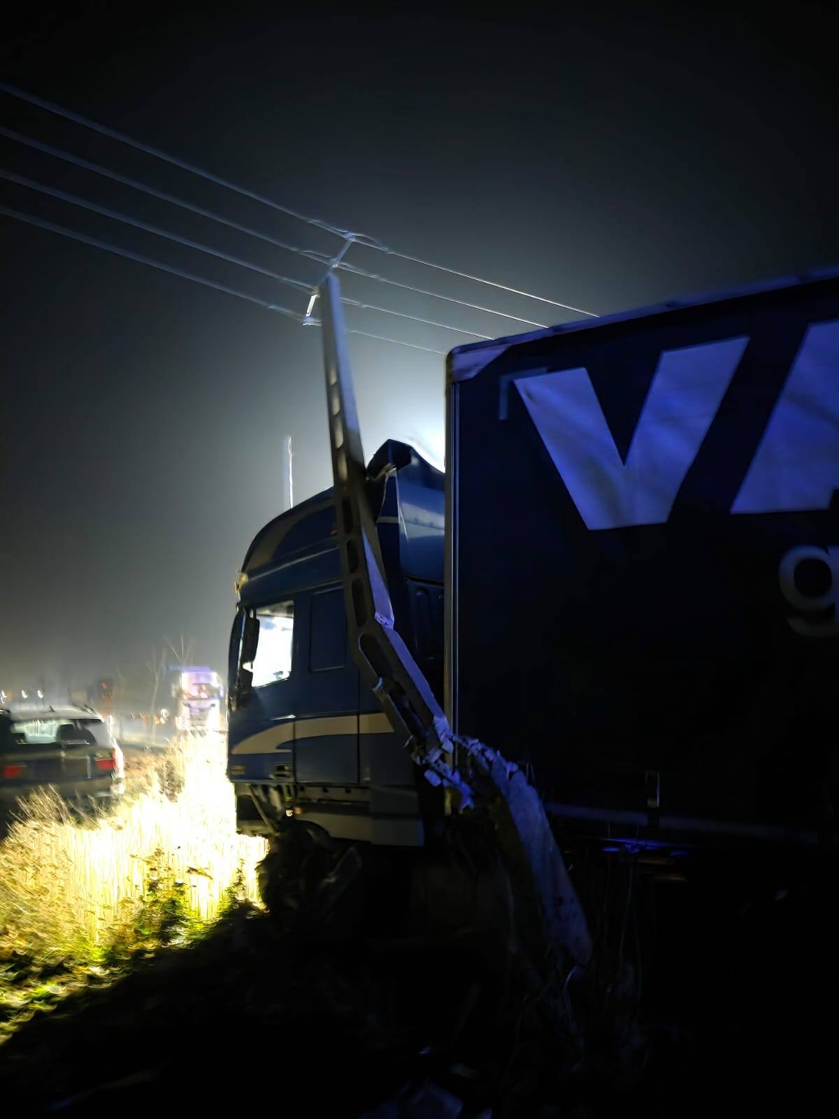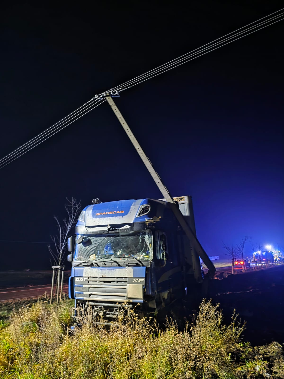 - Zgłoszenie otrzymaliśmy minutę przed godziną 18:00. Doszło do zderzenia samochodu ciężarowego z osobowym. Konieczne było wykonanie dostępu do kierowcy przy pomocy narzędzi hydraulicznych. Ratownicy zdecydowali, że kierowca został zabrany do szpitala. Dodatkowym utrudnieniem jest fakt, że samochód ciężarowy uderzył w słup energetyczny uszkadzając go, dlatego droga jest nadal nieprzejezdna. Trudno powiedzieć, kiedy skończą się utrudnienia - przekazał brygadier Paweł Korgol z KM PSP w Grudziądzu.