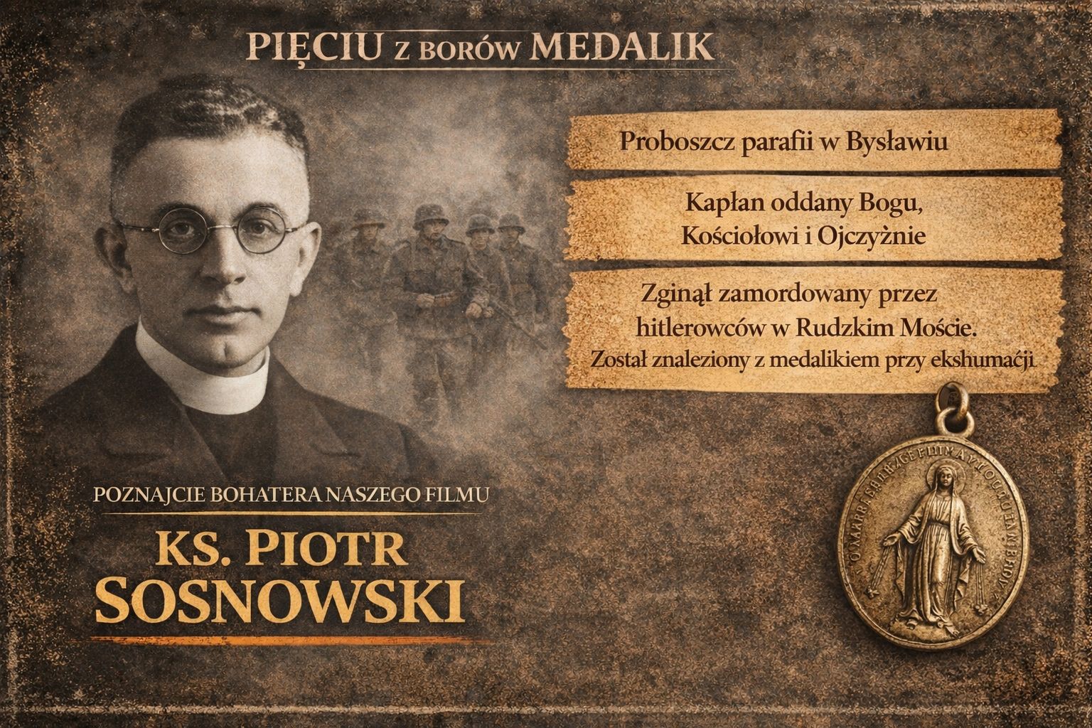 - To właśnie przy ks. Sosnowskim odnaleziono medalik, który stał się symbolem całej historii i dał tytuł naszemu filmowi. Medalik rozpoznała gosposia, pani Franciszka, potwierdzając tożsamość zamordowanego kapłana - opisują autorzy projektu. - Był gorliwym duszpasterzem i oddanym pedagogiem, który łączył pracę duchową z edukacją młodzieży i troską o polską tożsamość Pomorza - dodają.