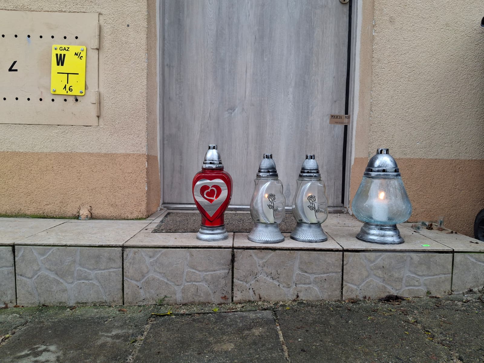 Pod wejściem do mieszkania, w którym zginęła kobieta i troje dzieci, płoną znicze/fot. Marcin Doliński