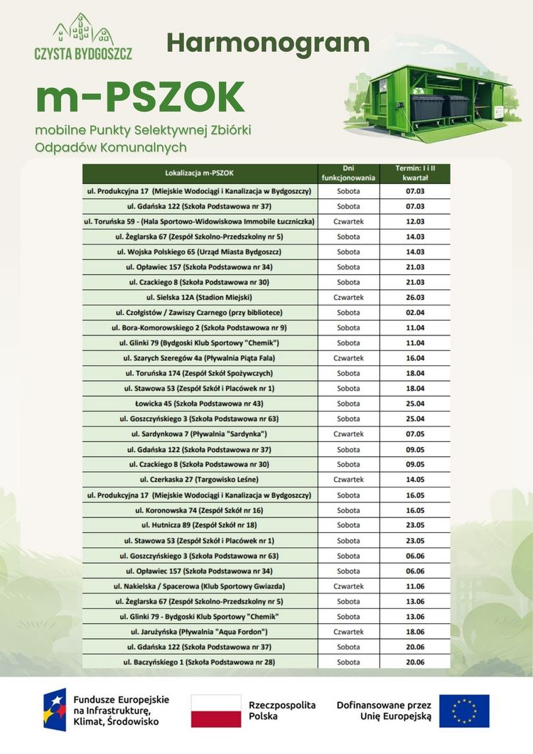 Dzięki tej inicjatywie Bydgoszczanie będą mogli pozbyć się niewielkich odpadów, takich jak odzież, baterie, akumulatory, mały sprzęt AGD, opony czy przeterminowane leki. Pierwsze kursy mobilnych PSZOK-ów zaczęły się w sobotę, 7 marca.