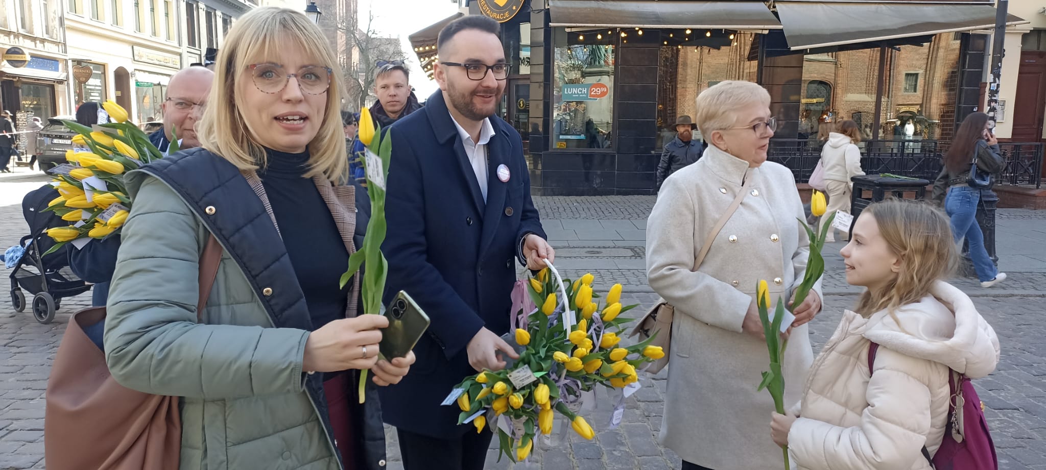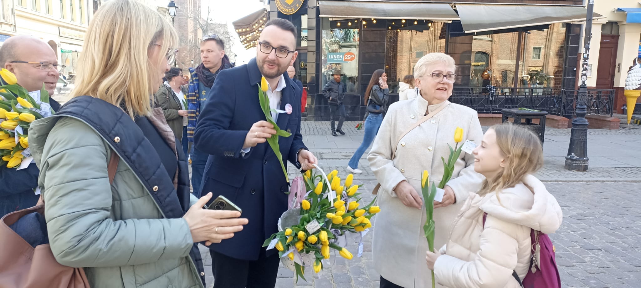 Poseł na Sejm RP Piotr Kowal z Nowej Lewicy Dzień Kobiet spędził na toruńskiej starówce. Tam rozdawał paniom żółte tulipany.