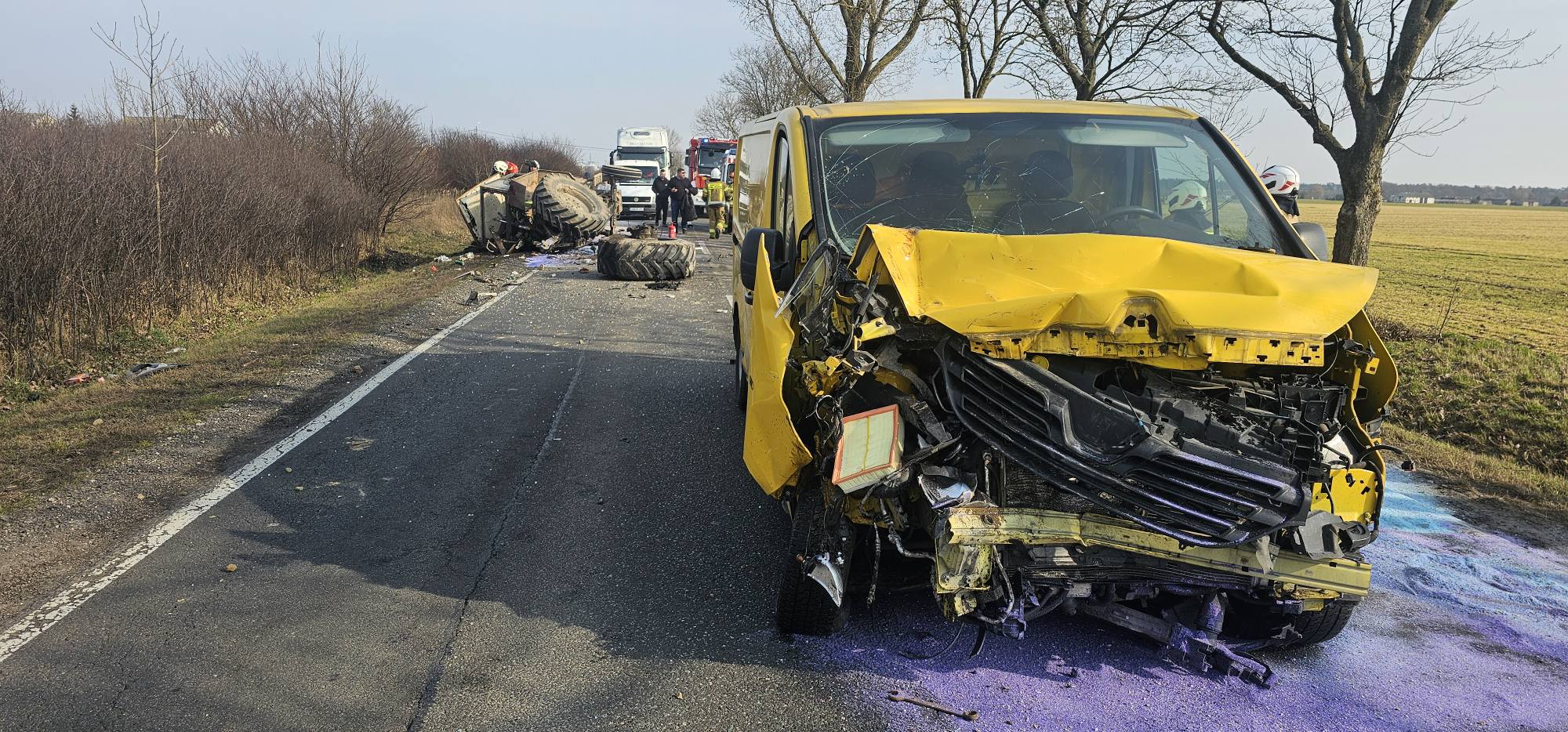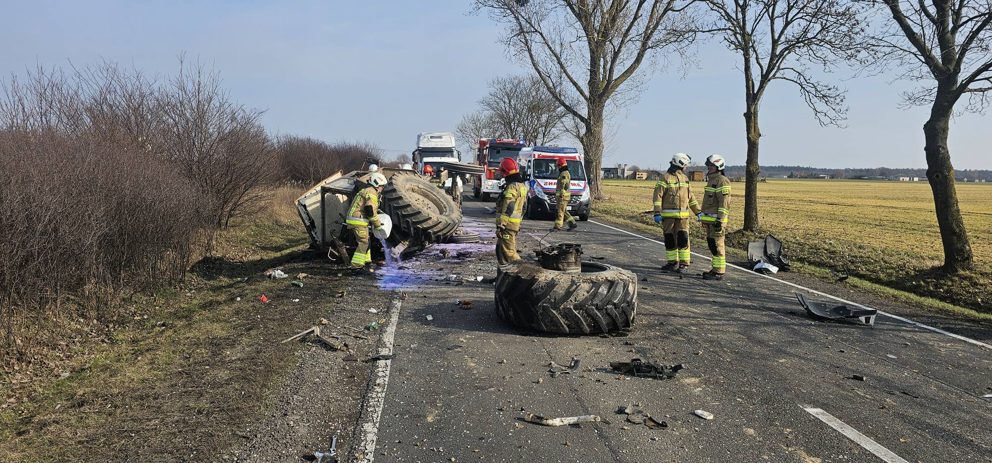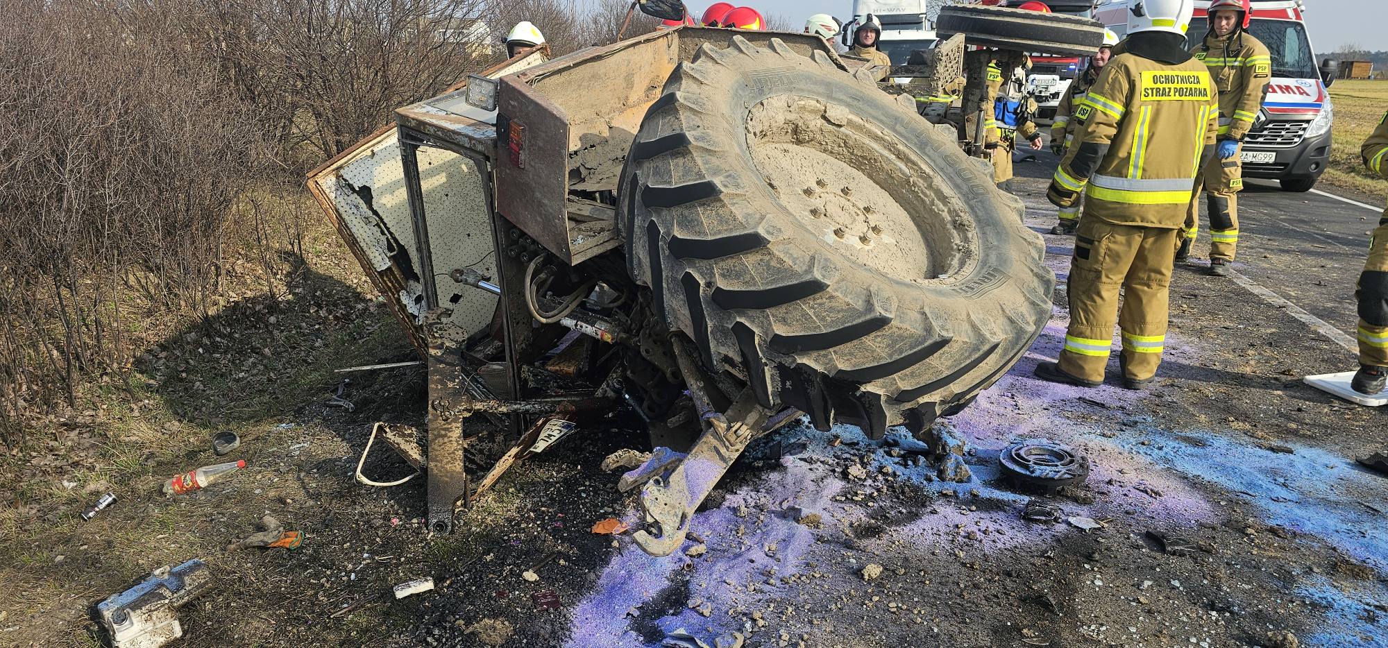 Do wypadku doszło w środę, około godz. 14:00. Na miejscu zdarzenia strażacy zastali dwa pojazdy: busa i ciągnik z urwanym tylnym kołem leżący na poboczu.