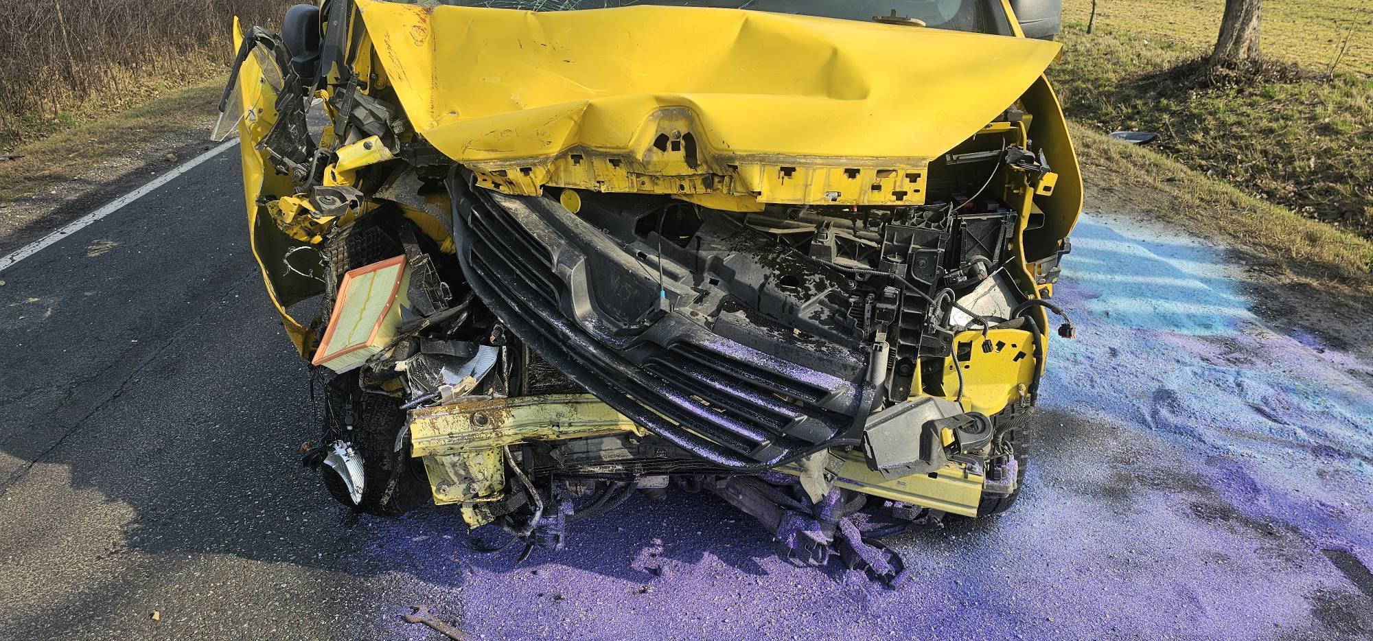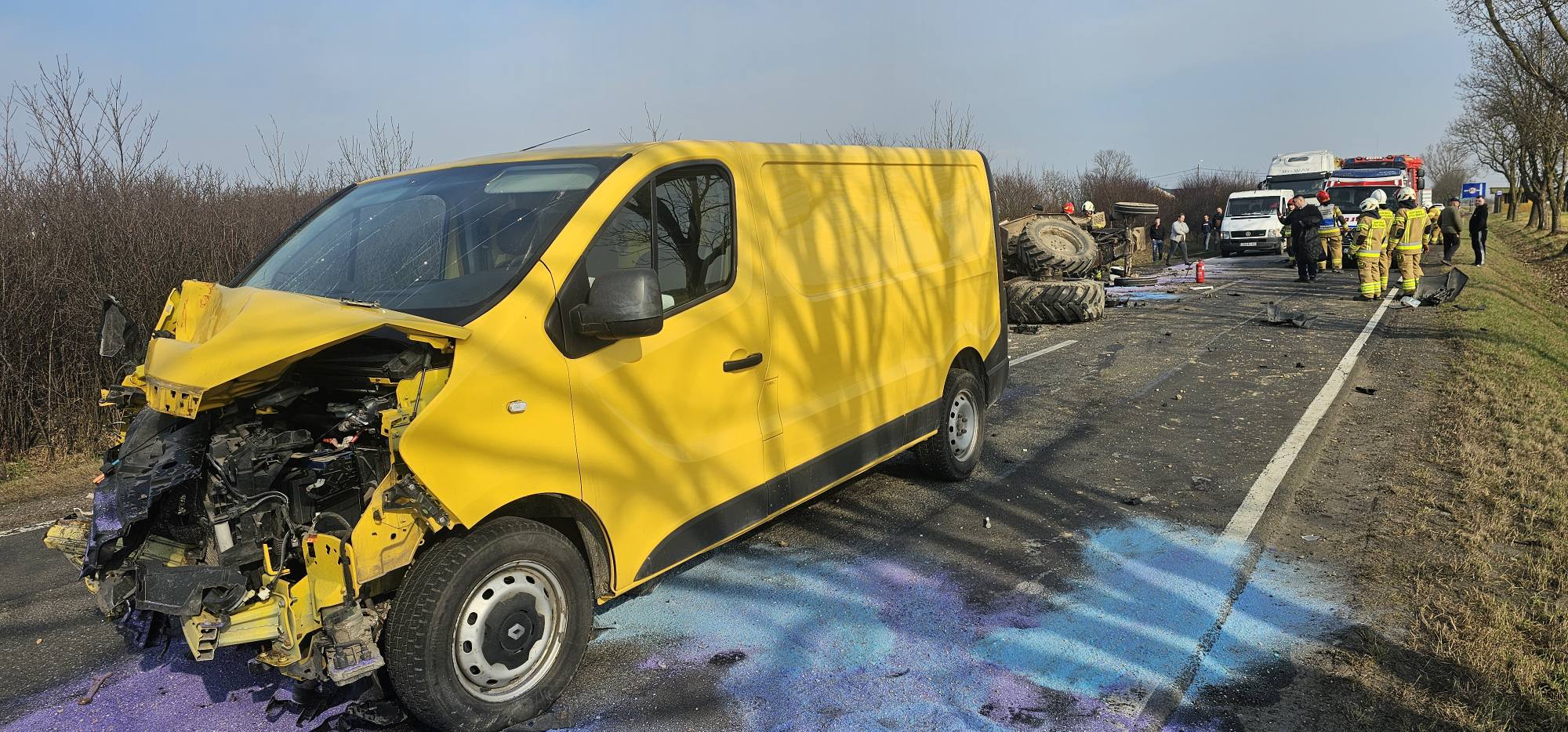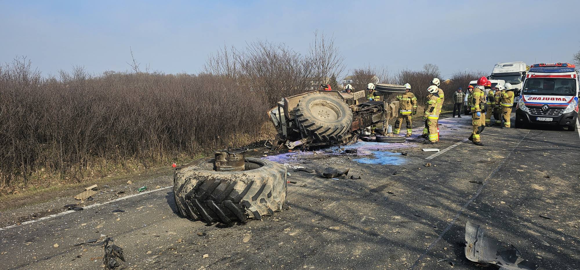 Do wypadku doszło w środę, około godz. 14:00. Na miejscu zdarzenia strażacy zastali dwa pojazdy: busa i ciągnik z urwanym tylnym kołem leżący na poboczu.