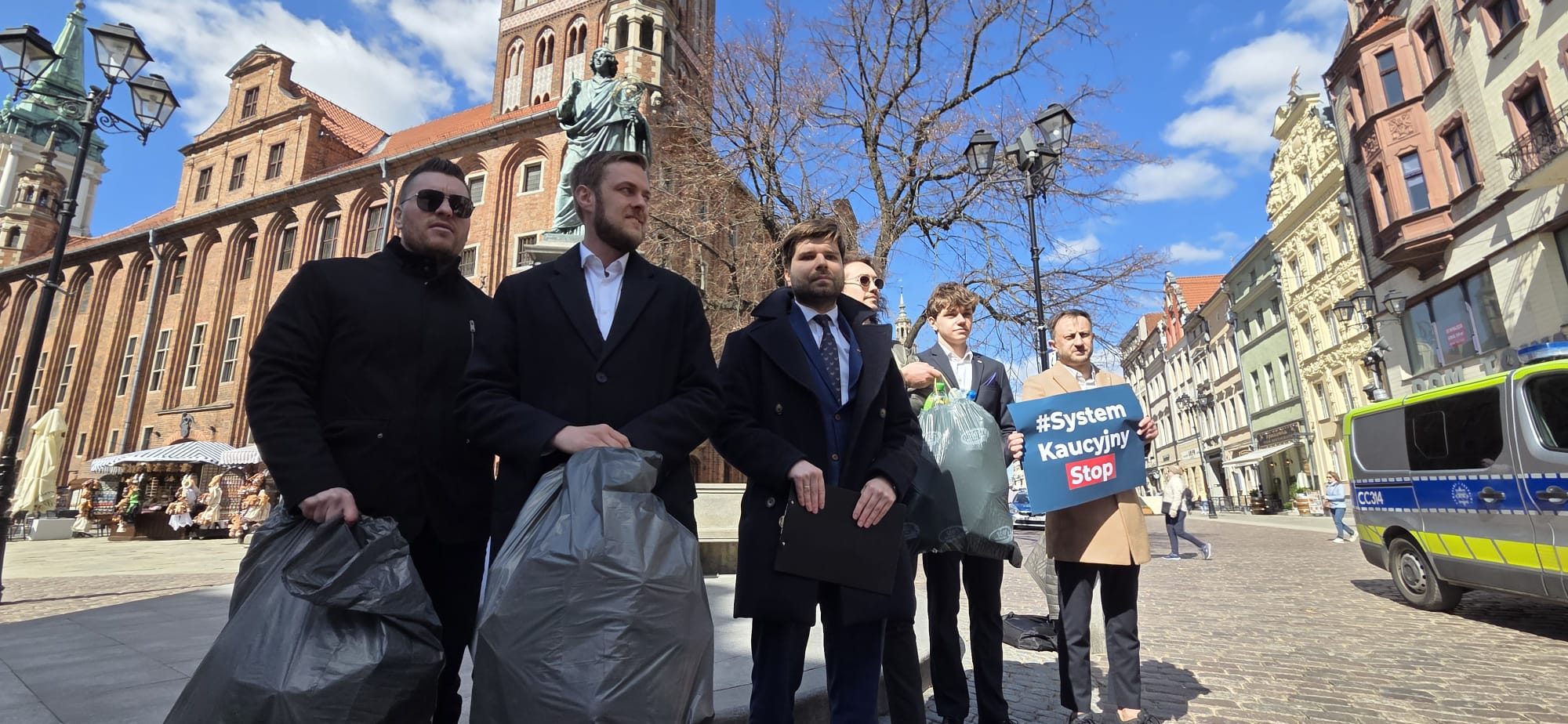 - To uderzenie w portfele Polaków i chaos logistyczny – mówili pod pomnikiem Mikołaja Kopernika Marcin Łasiński, prezes Okręgu Toruńskiego oraz Jakub Dziadosz z Nowej Nadziei. Organizatorzy, winą za – ich zdaniem – wadliwy system obarczyli obecny i poprzedni rząd. Na znak protestu chcieli symbolicznie zwrócić pomysłodawcom worki z pustymi opakowaniami. Zapukali do drzwi biura senatora Koalicji Obywatelskiej, Tomasza Lenza.