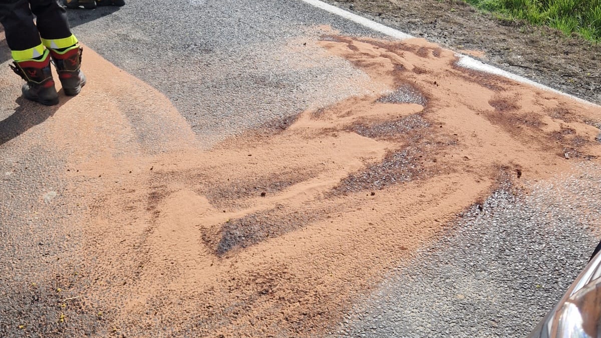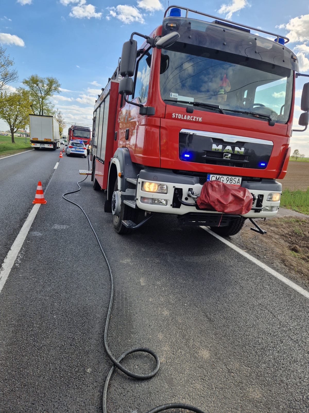 Ładunek przebił kabinę ciężarówki na DK25. Doszło od wycieku oleju napędowego/fot. KP PSP Mogilno