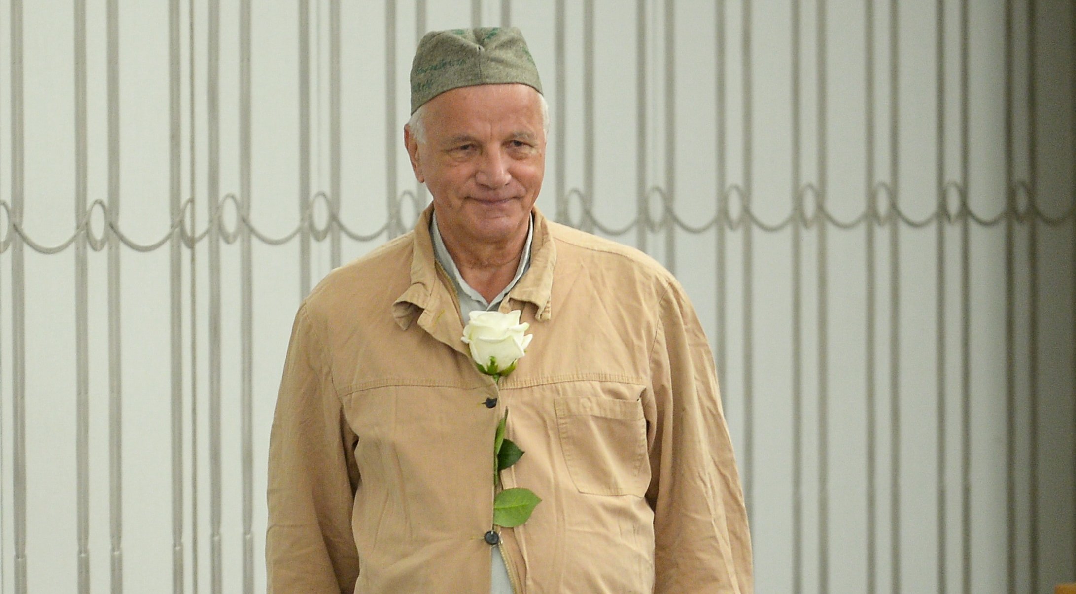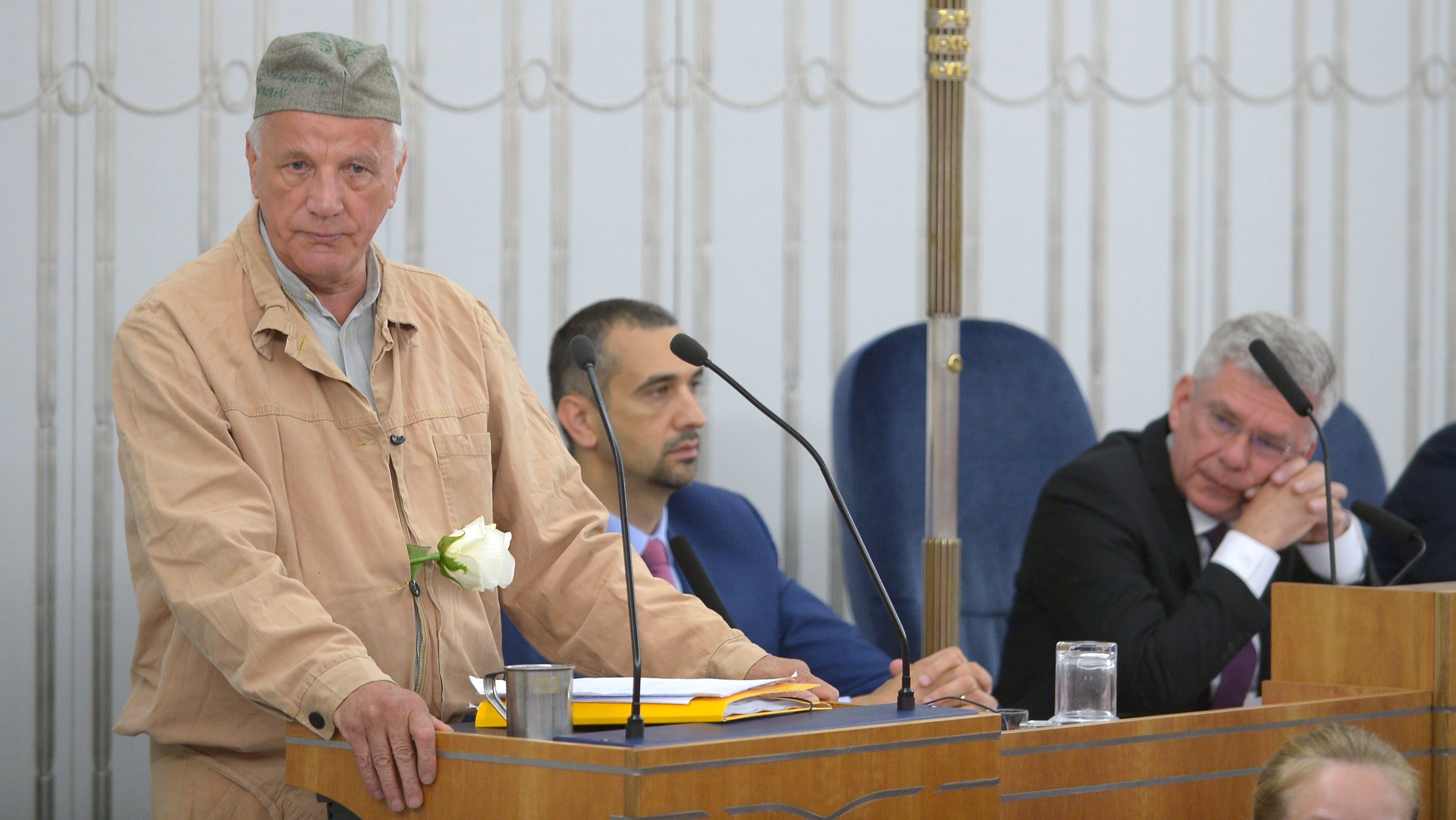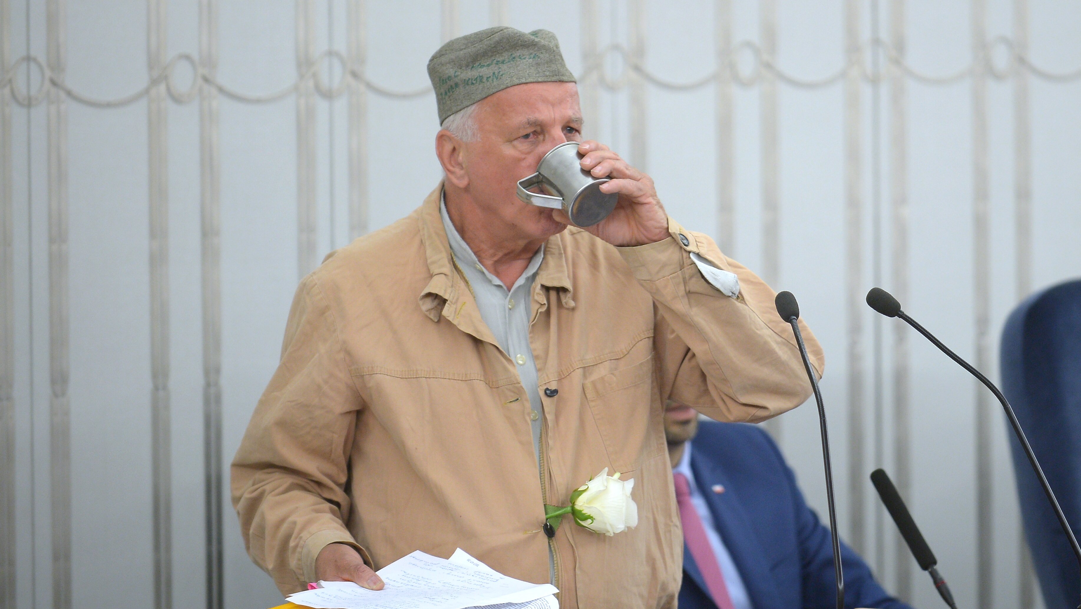 Bydgoski senator Platformy Obywatelskiej Jan Rulewski pojawił się na obradach Senatu w więziennym drelichu i furażerce oraz z białą różą. Fot. PAP/Marcin Obara