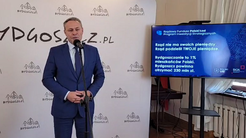 „ (...) Prezydent uważa bowiem, że Bydgoszczy należało się z Funduszu Polski Ład 230 milionów złotych. Założył, że w Bydgoszczy mieszka 1% ludności Polski, a 230 mln to 1% z kwoty 23 mld zł, które trafiły do samorządów. W związku z tym: skoro prezydent wyliczył, że należy mu się 230 mln zł, to dlaczego złożył trzy wnioski na łączną kwotę 485 mln zł? Jego dzisiejsze słowa przeczą jego wcześniejszym decyzjom! Bydgoszcz złożyła 3 wnioski - na 5, na 30 i na 450 mln zł. Dwa pierwsze zostały rozpatrzone pozytywnie, trzeci był niemożliwy do zrealizowania z uwagi na bardzo wygórowane wymagania finansowe. Nikt w kraju nie otrzymał tak wielkiego dofinansowania (Warszawa dostała łącznie 150 mln zł). Wnioski nie były także finansowane "w części".