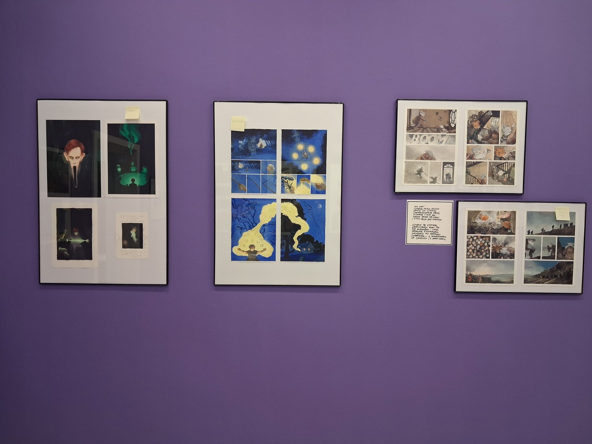 Na ścianach galerii pojawiły się rysunki oraz oryginalne plansze do komiksów. - Mamy też ilustracje do książek, magazynów - opowiada Dominika Krawańska. - Mamy storyboardy, bo okazuje się, że Joanna Karpowicz w swoim bogatym dorobku, nie wszędzie znanym, zajmowała się również produkcją sekwencji do filmów, na przykład z „Ciemno, prawie noc” Borysa Lankosza. Na wystawie są przekrojowe prace, także bardzo nieznane aspekty jej artystycznej działalności dlatego, że artystka ta znana jest głównie z malarstwa. Natomiast tutaj prezentujemy komiks, ilustracje i rysunki wprost z jej klaserów, z jej pracowni - dodaje.